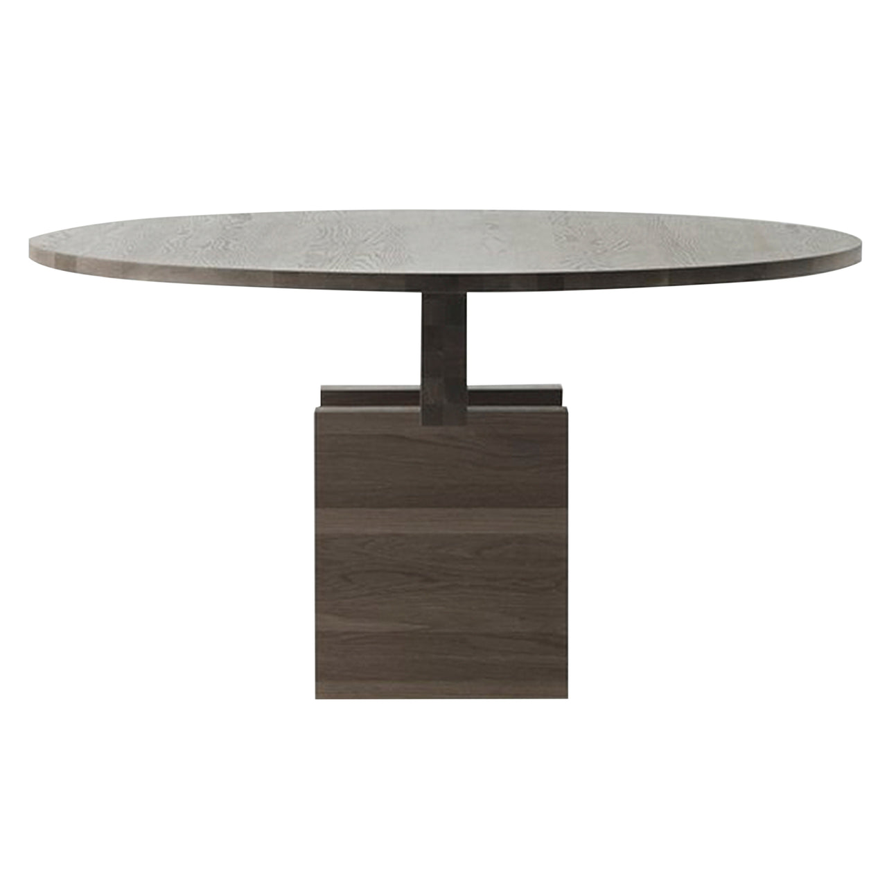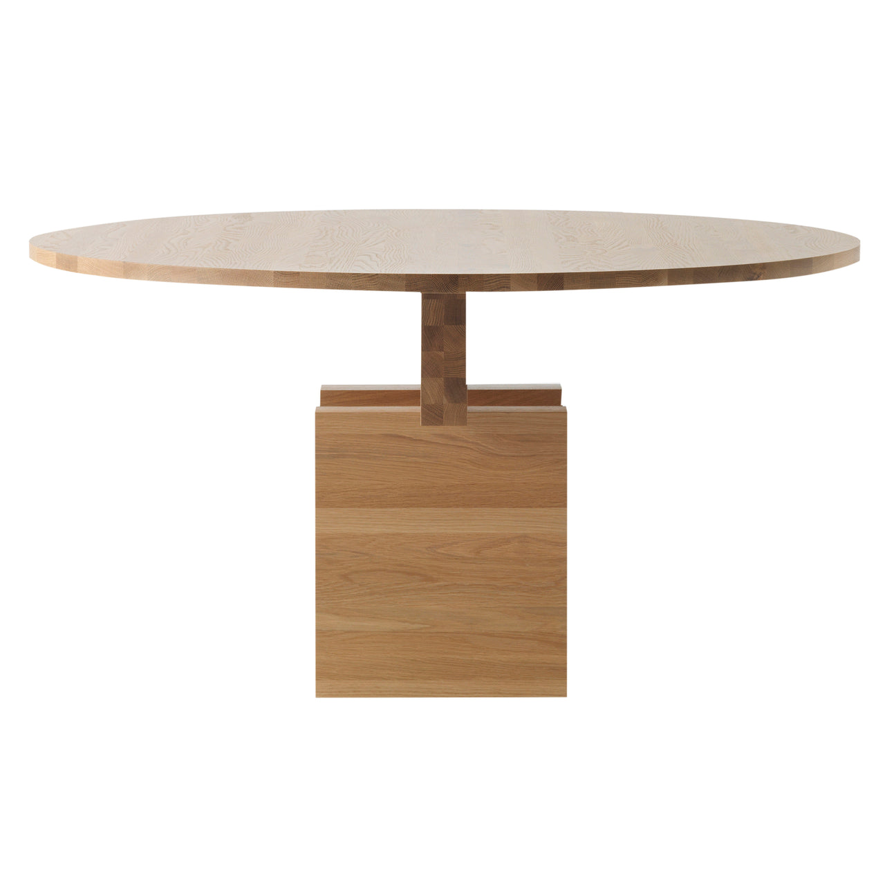 Remarkably poised despite its seemingly unbalanced proportions, New Zealand designer Jamie McLellan adds a round dining version to his stacked-plank table series. Plane's solid engineering assures the center-aligned boards, cross beam and tabletop are securely held together with clever internal bracketing that's smartly hidden away within the solid timber. And the table ships efficiently flat-packed by maker Resident of New Zealand for untroubled easy assembly on arrival.