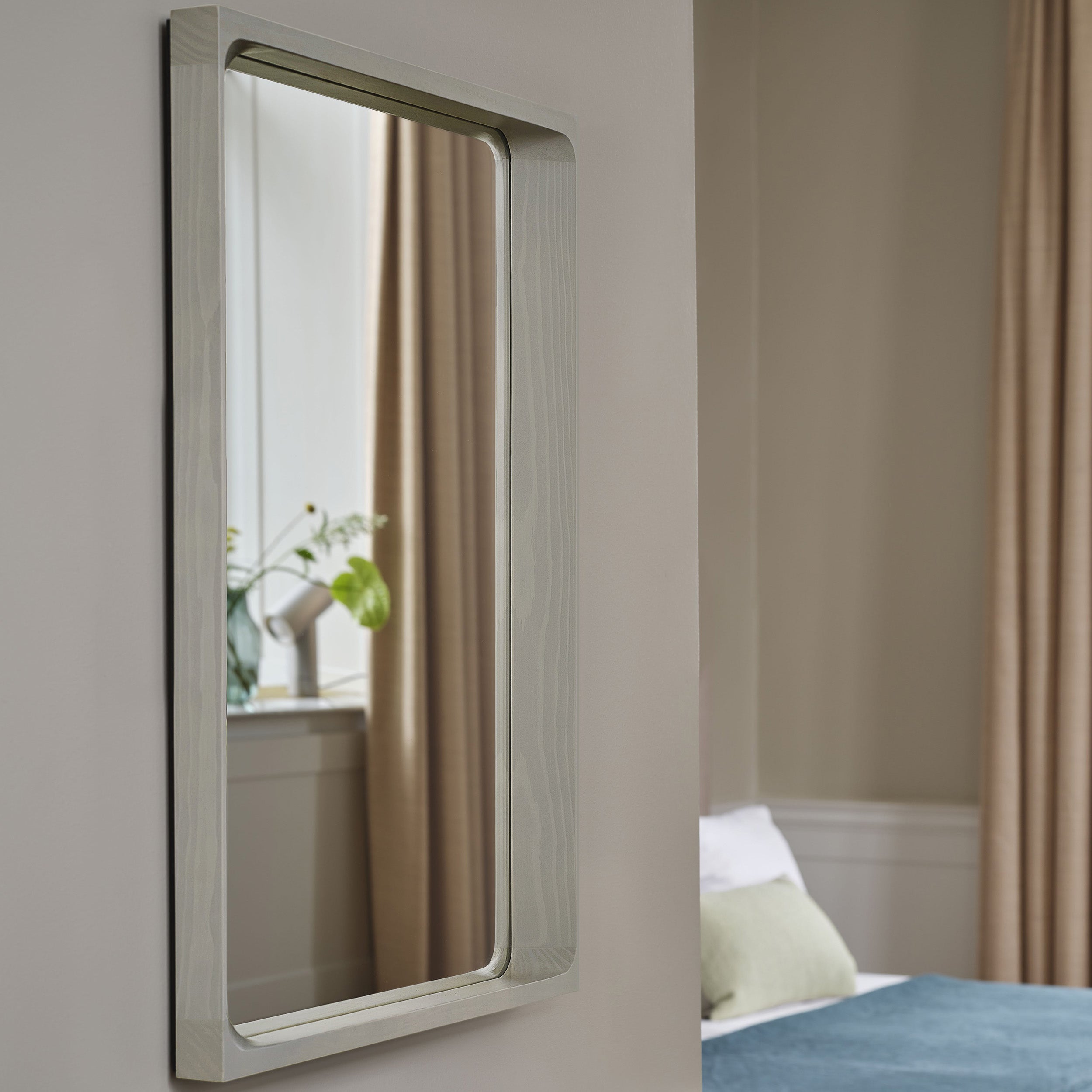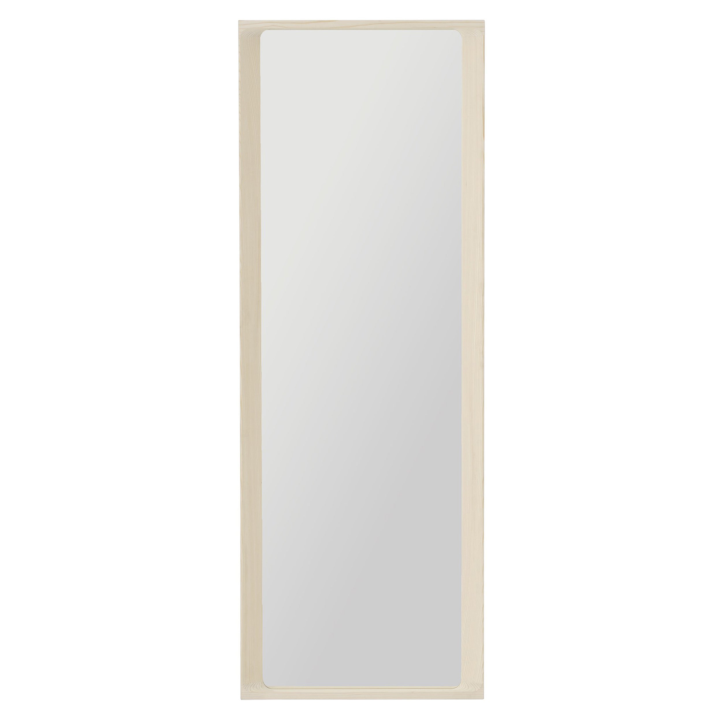 The Arced Mirror features a recessed frame and gently rounded edges, capturing the essence of a windowpane while maintaining a refined profile. Crafted from FSC™-certified spruce wood, the frame is treated with a wood stain and finished in a clear matte lacquer to highlight its natural grain. Drawing inspiration from the arched windows of Sydney's architecture, the mirror is available in two sizes and five finishes: Light Grey, Light Green, Light Lilac, Midnight Blue, and Spruce. A discreet ledge at the base provides space for small personal items. Designed for both vertical and horizontal mounting.