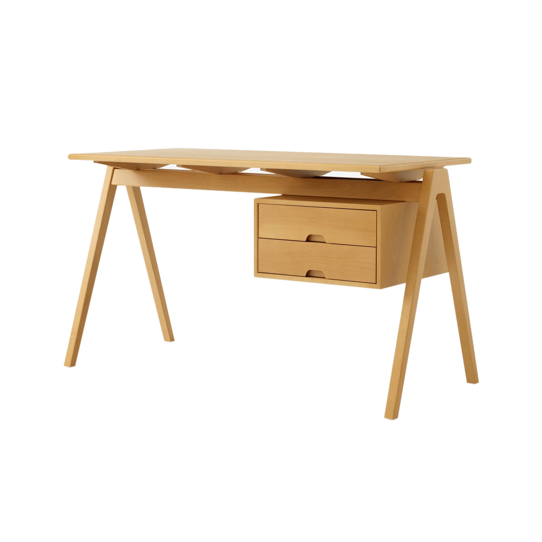 The RD3 Daystak Desk showcases mid-century design influences with its distinctive A-shaped legs—a hallmark feature shared across the Daystak series, including the side chair and dining table. Available in lacquered beech or with a Fenix Nano laminate top in Verde Comodoro. The desk includes an integrated drawer unit with visible dovetail joinery, showcasing careful craftsmanship. The drawers provide ample storage, making it well-suited for both home offices and studio environments while keeping essentials organized and out of sight.