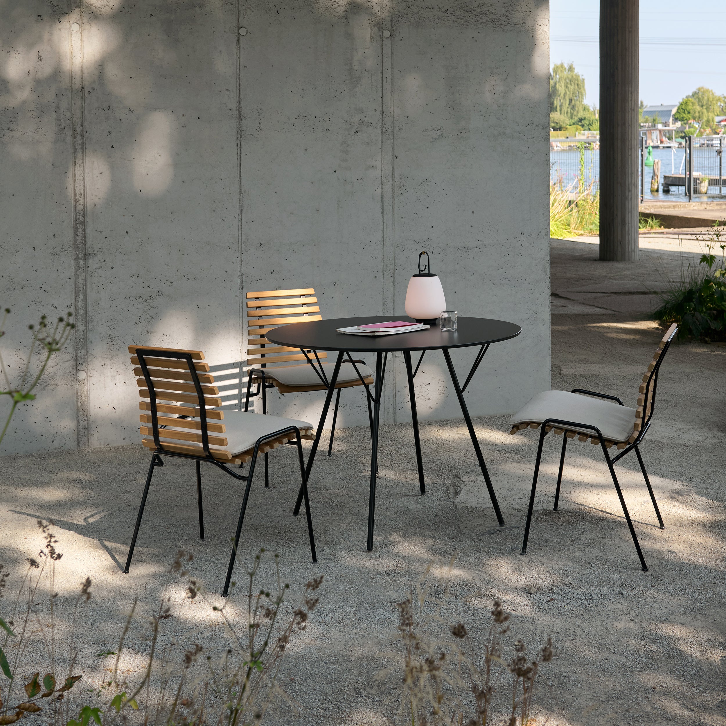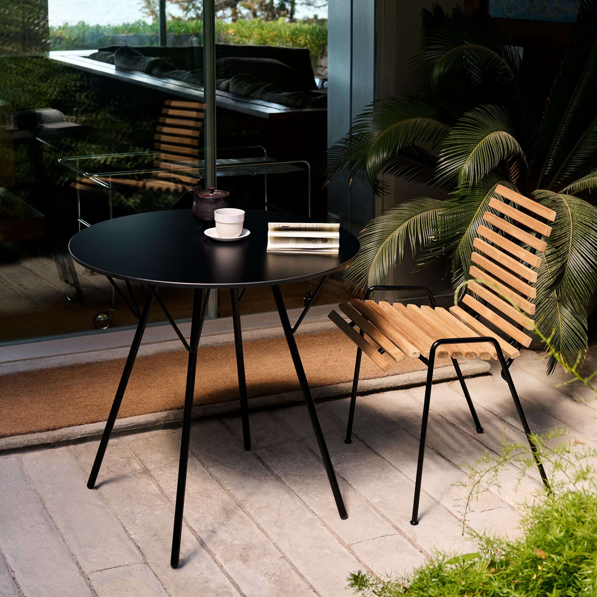 The RFH Terrace Tables RD5 and RD6 by &Tradition, designed by Robin Day, offer a sleek and durable design created for the terraces of London’s Royal Festival Hall. Both models feature black powder-coated steel frames, providing a weather-resistant and sturdy finish ideal for outdoor use. The minimalist design includes splayed legs, adding a touch of industrial style while ensuring stability on a variety of surfaces. The tabletops are crafted from compact high-pressure laminate, finished with acrylic lacquer and melamine resin, making them highly durable against environmental wear. Designed to pair seamlessly with the RFH chair collection, these tables suit both modern and classic outdoor settings, perfect for terraces, patios, or garden dining areas. Plastic gliders are included to protect floors and allow easy movement.