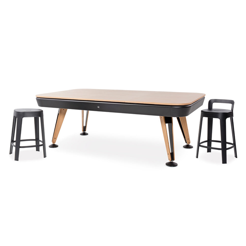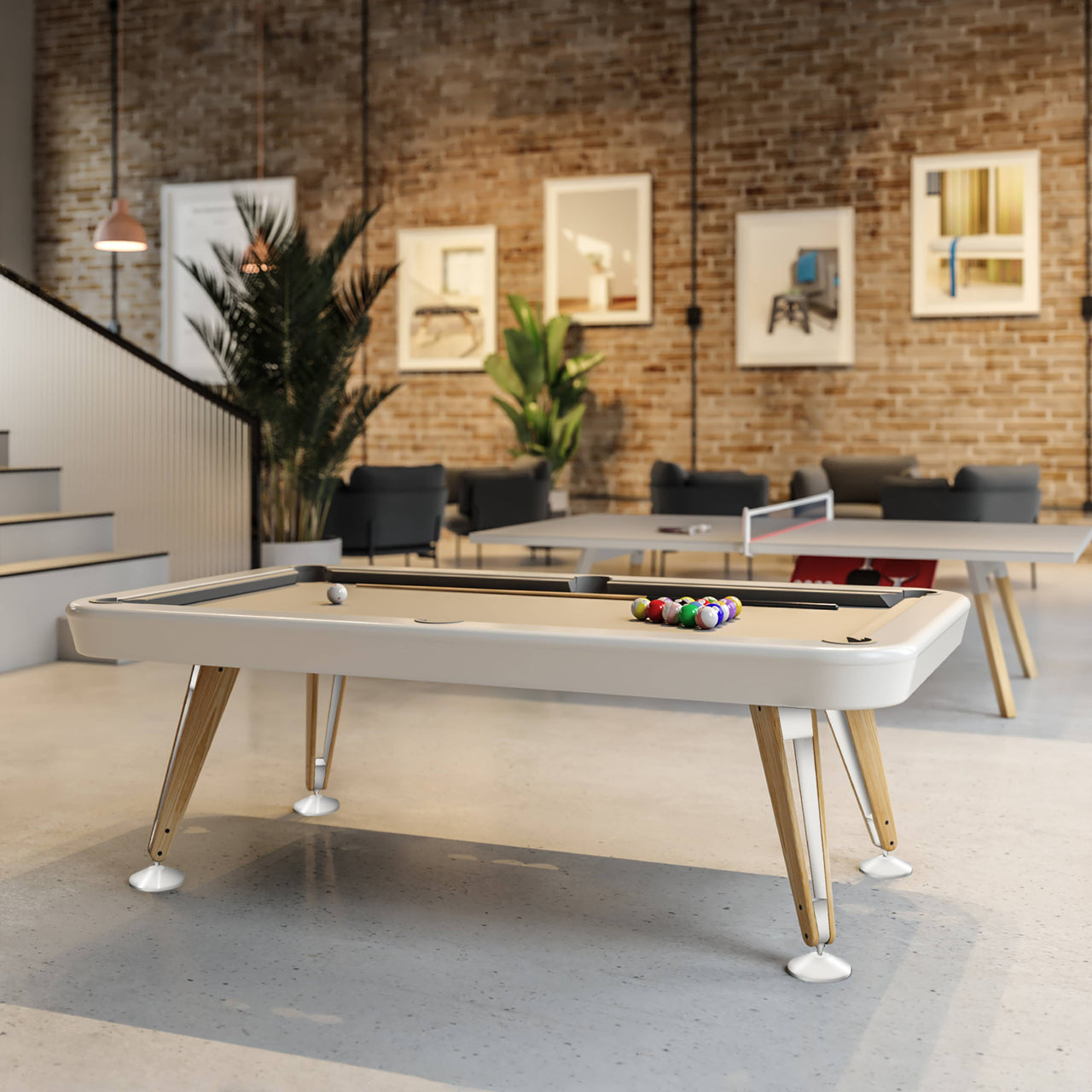 The talented duo Clara del Portillo and Alex Selma of Yonoh say their handsome pool table is inspired by one of the main streets in the city of Barcelona. Diagonal has a light-handed elegance, fashioned in a contemporary mix of steel coated with durable polyester paint and either iroko, walnut or oak wood. Faultlessly crafted by RS Barcelona, it joins the rest of the game lineup from the family-owned company that declares, “It’s about generating smiles.”