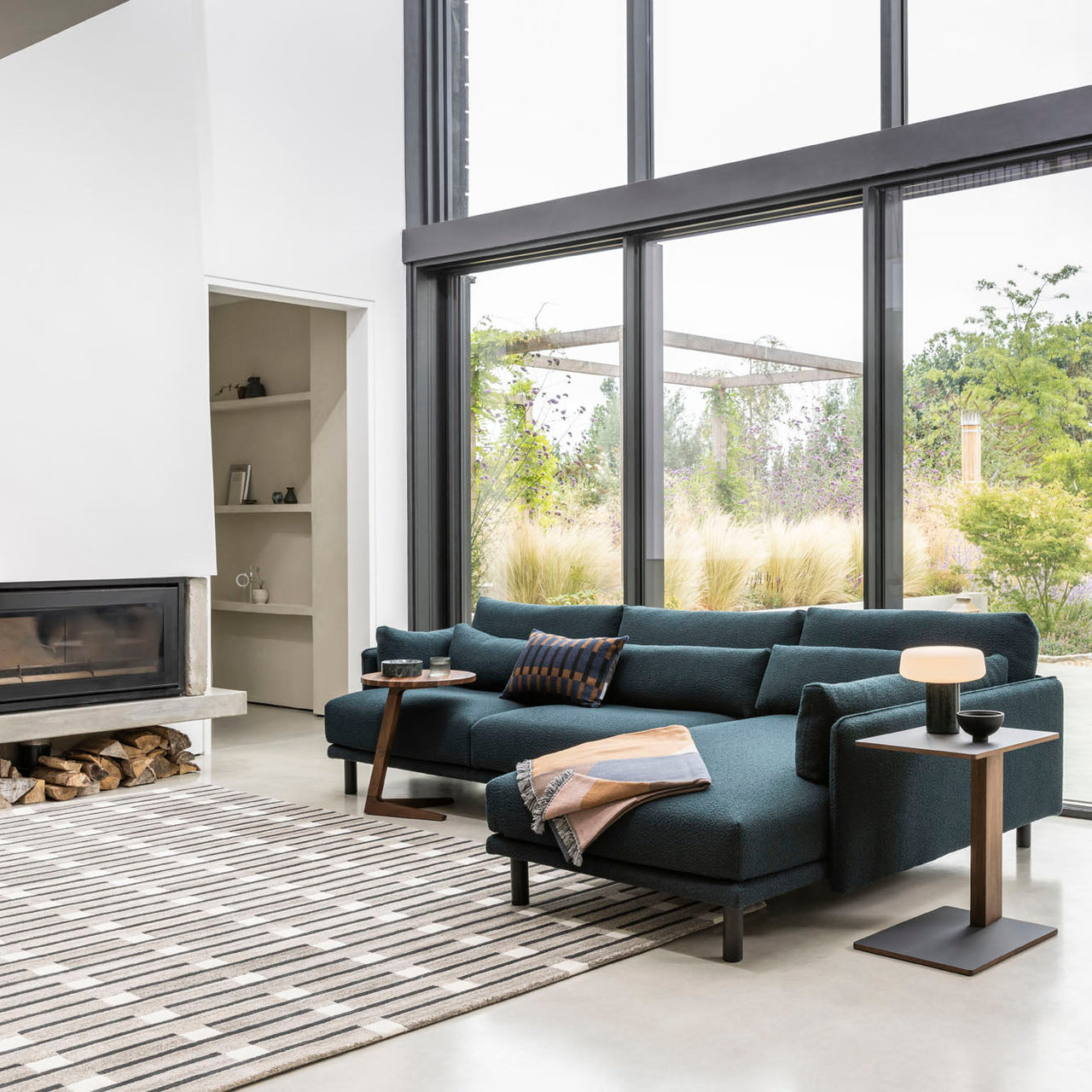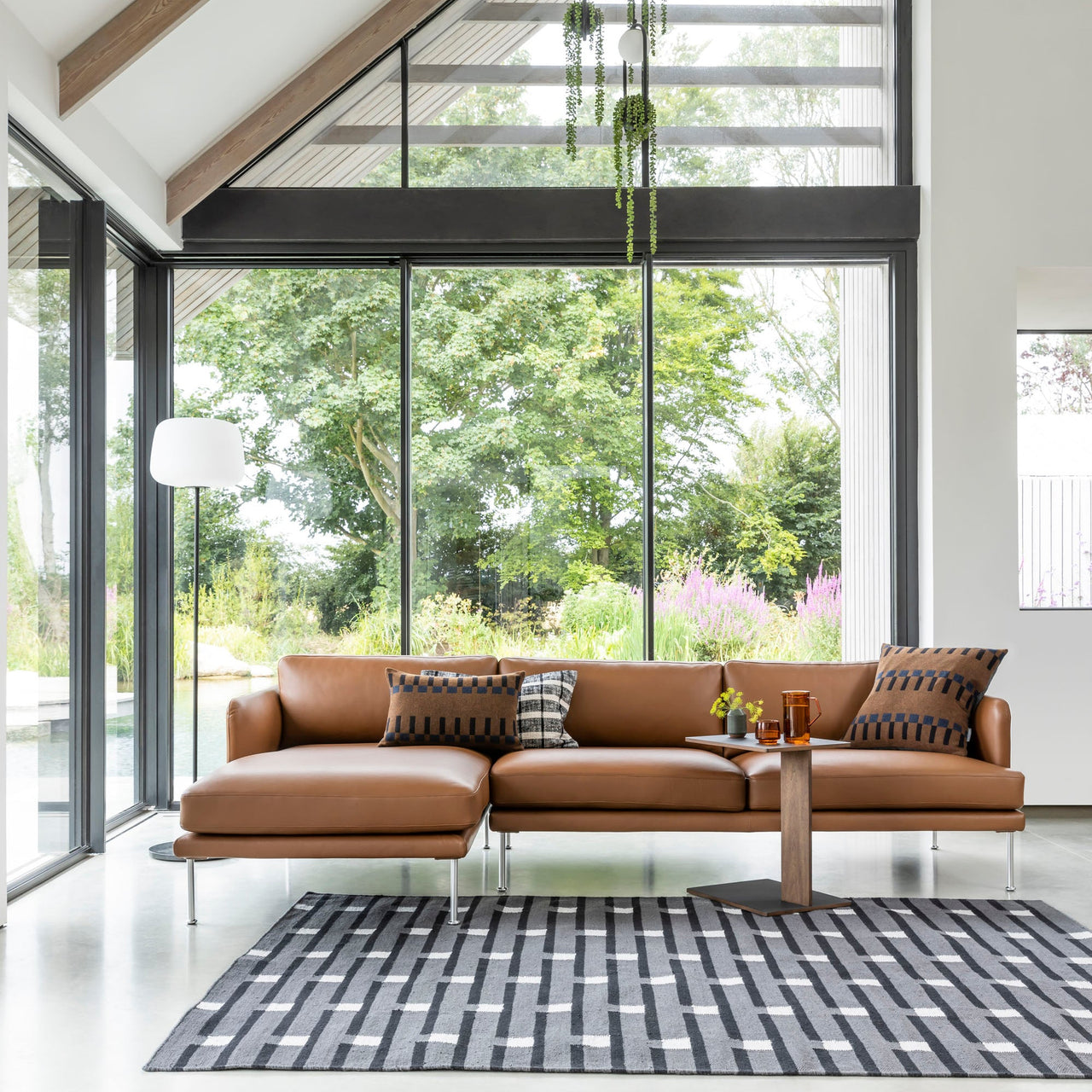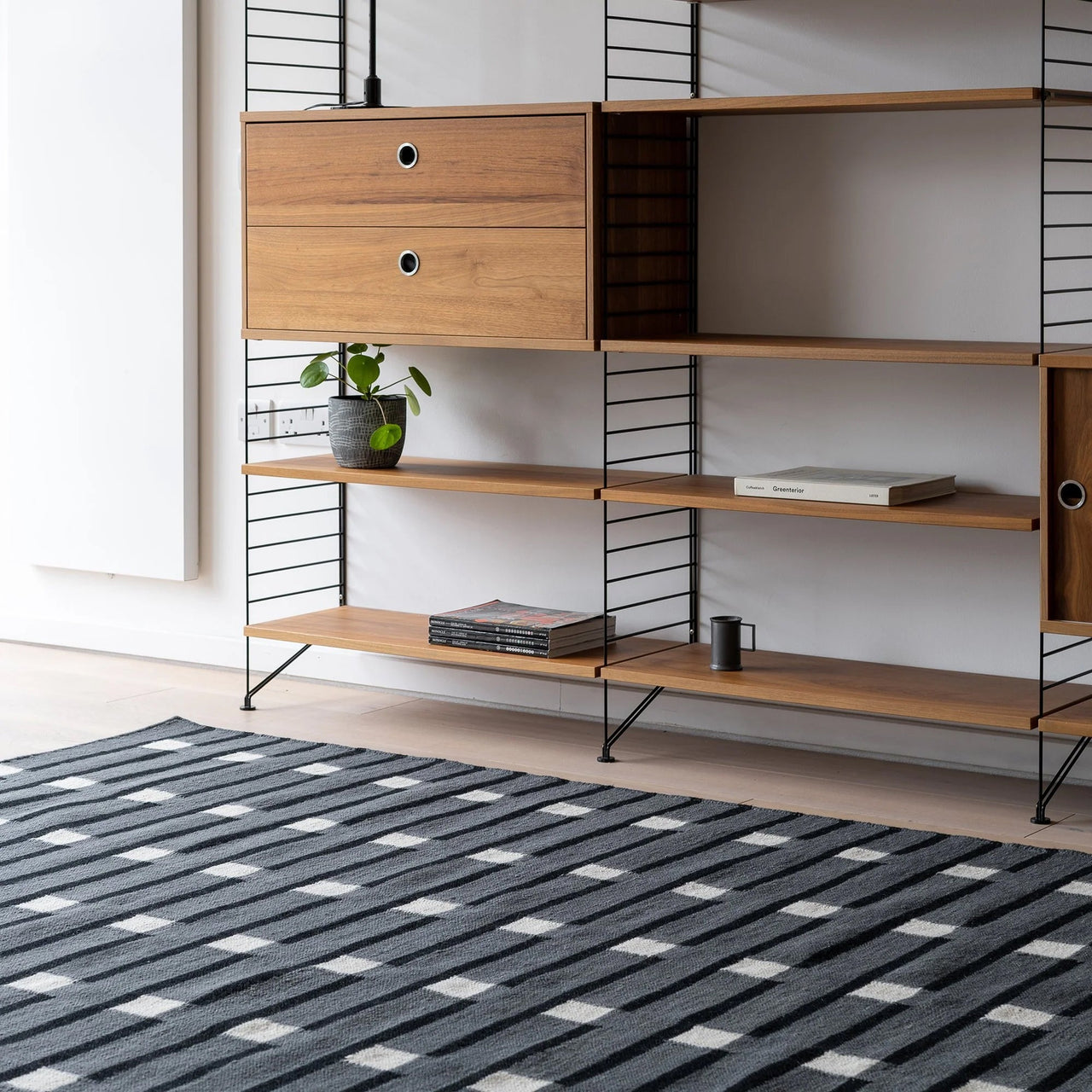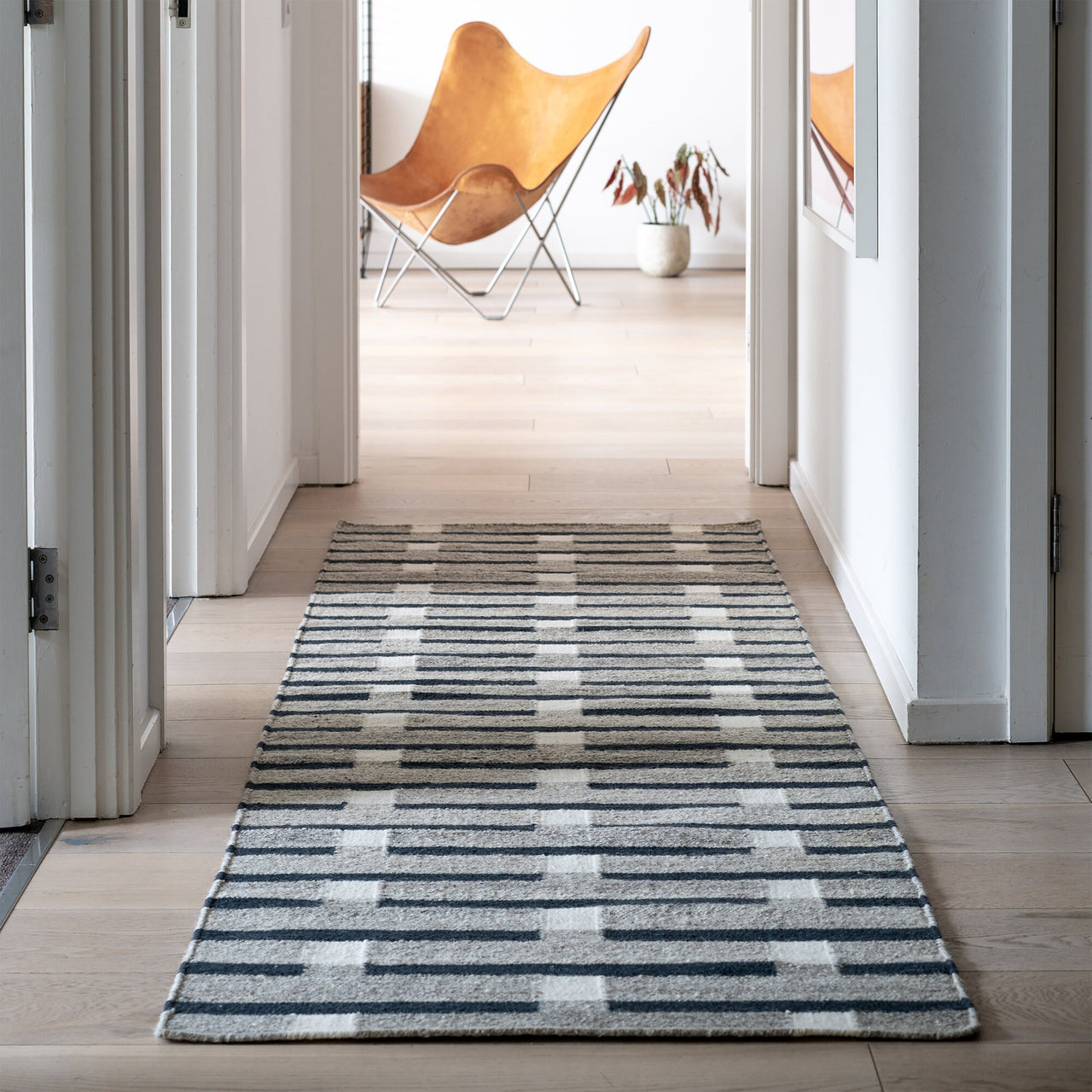 Designed in London, the city’s skyline inspired Purlin’s graphics, handwoven in India as envisioned by designer Eleanor Pritchard. With a steady geometrical pattern of long narrow bars alternating with square blocks, Purlin comes in either a durable hand-tufted version with sheared pile or a flat-weave style with a smooth finish and no pile.