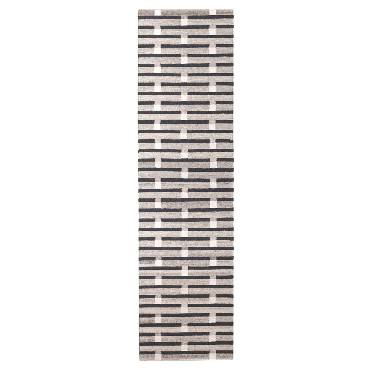 With a sprightliness suggested by London’s skyline, designer Eleanor Pritchard adds a runner to the geometric Purlin series, skillfully handwoven in India. In a repeat pattern of long narrow bars alternating with square blocks, the rug comes in either a durable hand-tufted version with sheared pile or a flat-weave style with a smooth finish and no pile.