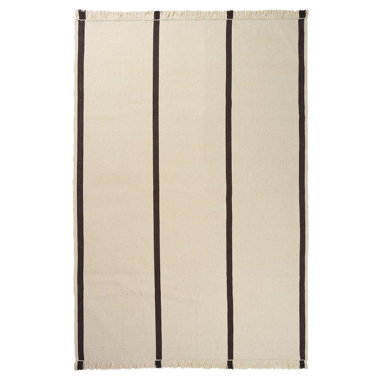 The Calm Kelim Rug blends traditional kelim craftsmanship with updated patterns and colorways. Handmade from 100% wool yarn, each rug is hand-dyed and woven on a 'Punja' loom, one of the oldest manual loom techniques, ensuring every piece is unique. Its design features soft, earthy tones and simple patterns, suitable for living rooms or bedrooms. The Kelim weave provides a coarse texture, bringing a distinct tactile quality to the rug.