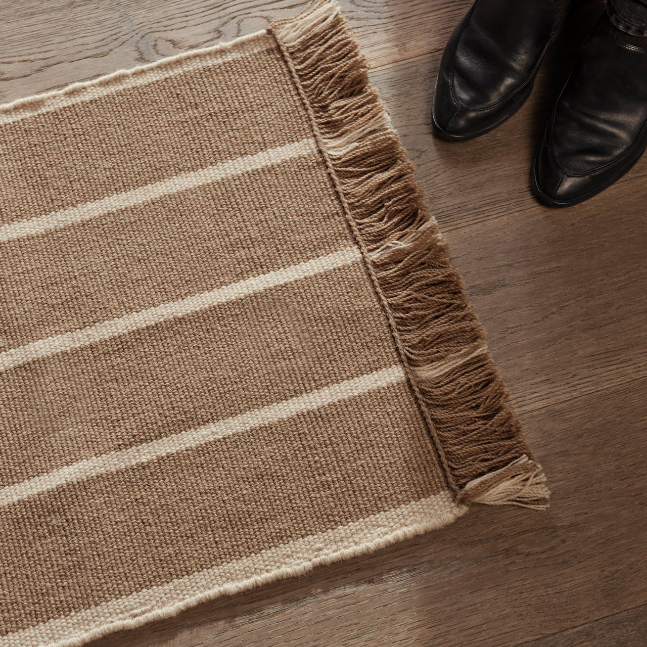 The Calm Kelim Runner combines traditional craftsmanship with a subtle, refined design. Made from 100% wool yarn, it is hand-dyed and woven on a 'Punja' loom, showcasing a coarse texture that reflects its artisanal origins. Each runner is unique due to its manual production process. Its elongated shape makes it suitable for narrow spaces like hallways, entryways, or alongside a bed. The design features muted earthy tones and simple geometric patterns, drawing inspiration from Scandinavian and Eastern textile traditions. The durable wool material is soft underfoot and built to last.