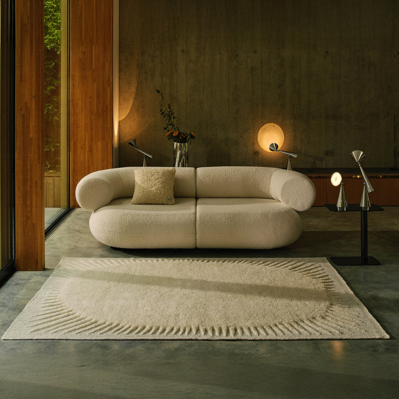 A defined border highlights the deep pile of the Edgy Rug, offering a bold visual and tactile contrast. Featuring a handwoven base and a cut-back hand-tufted pile, it reflects careful craftsmanship. Made by artisans in Northern India, the rug is offered in two sizes.