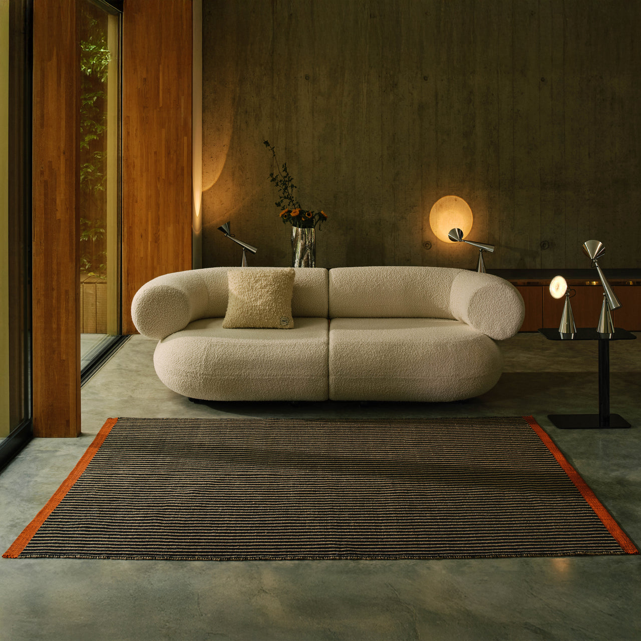 The Line Rug features a reversible flat weave made from mixed yarns, offering two distinct looks in one piece. Its bold black stripes are inspired by tiger markings and are offset by an orange woven band for visual contrast. Handcrafted by artisans in Northern India, it comes in three sizes.