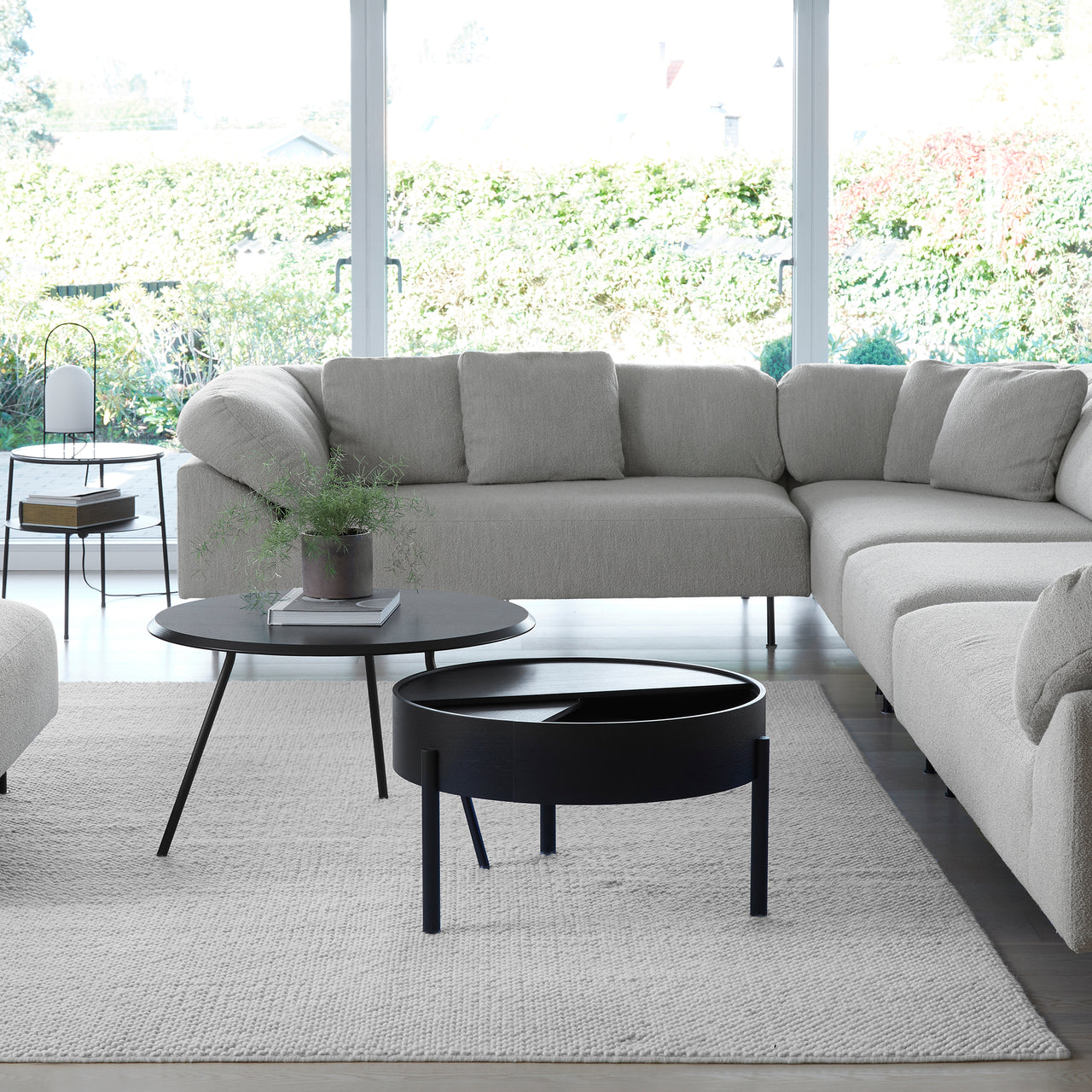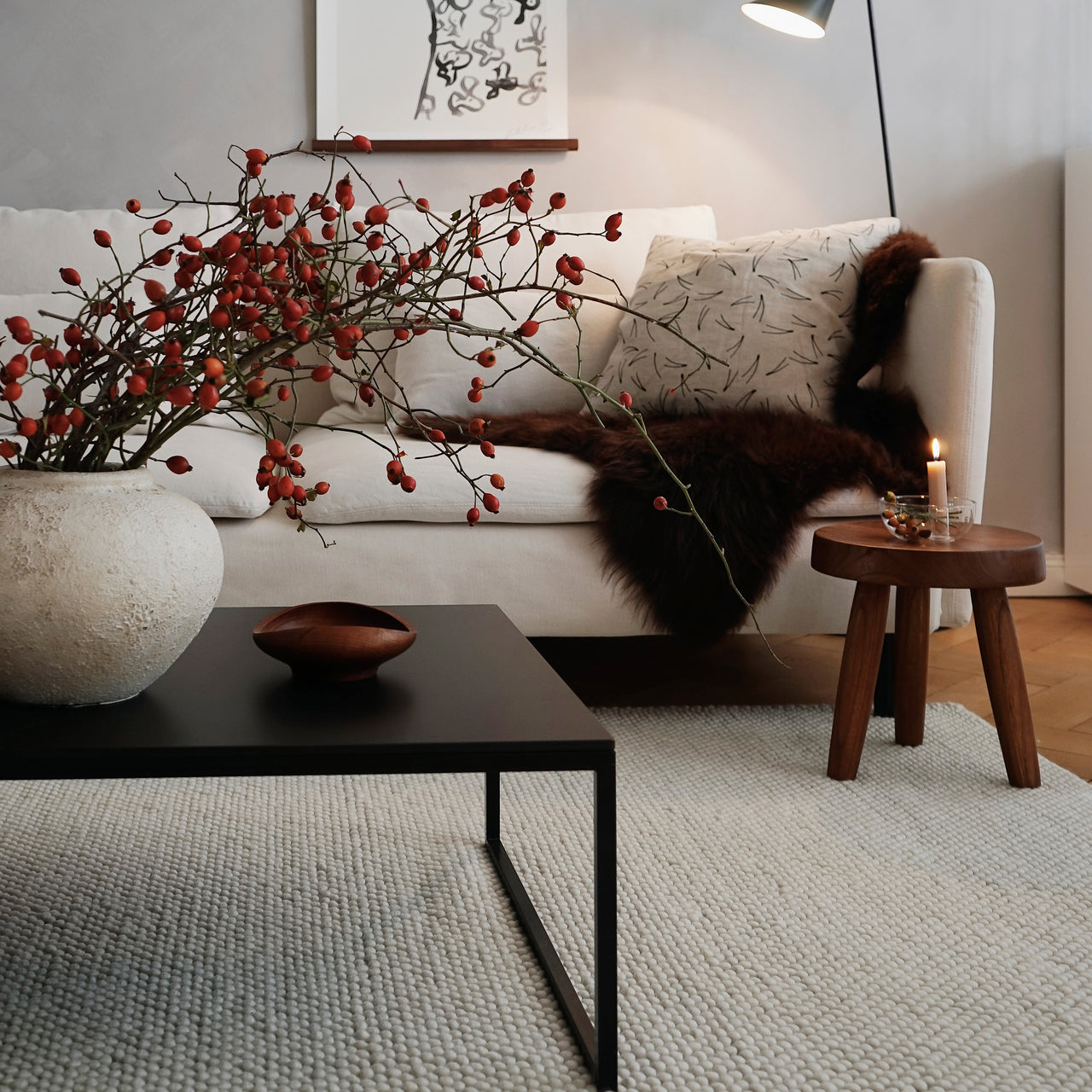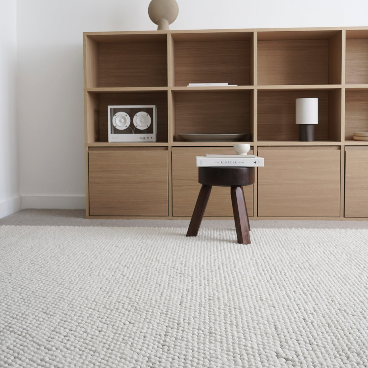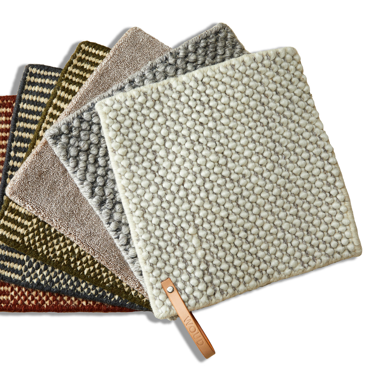 Tact is much more than a feast for the eyes. With woven loops that form a surface of circular droplets, Woud's wool area rug also stimulates and pleases the sense of touch. And the thickly fashioned, soft expanse has a welcome sound-reducing effect. With its rectangular, area-defining shape, the range of sizes suits varied kinds of spaces—from underscoring a coffee table in a conversation area to providing a warm and sensuous tread beside the bed.