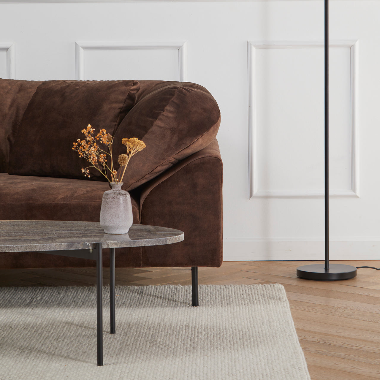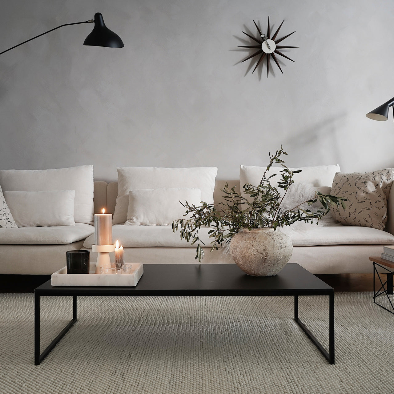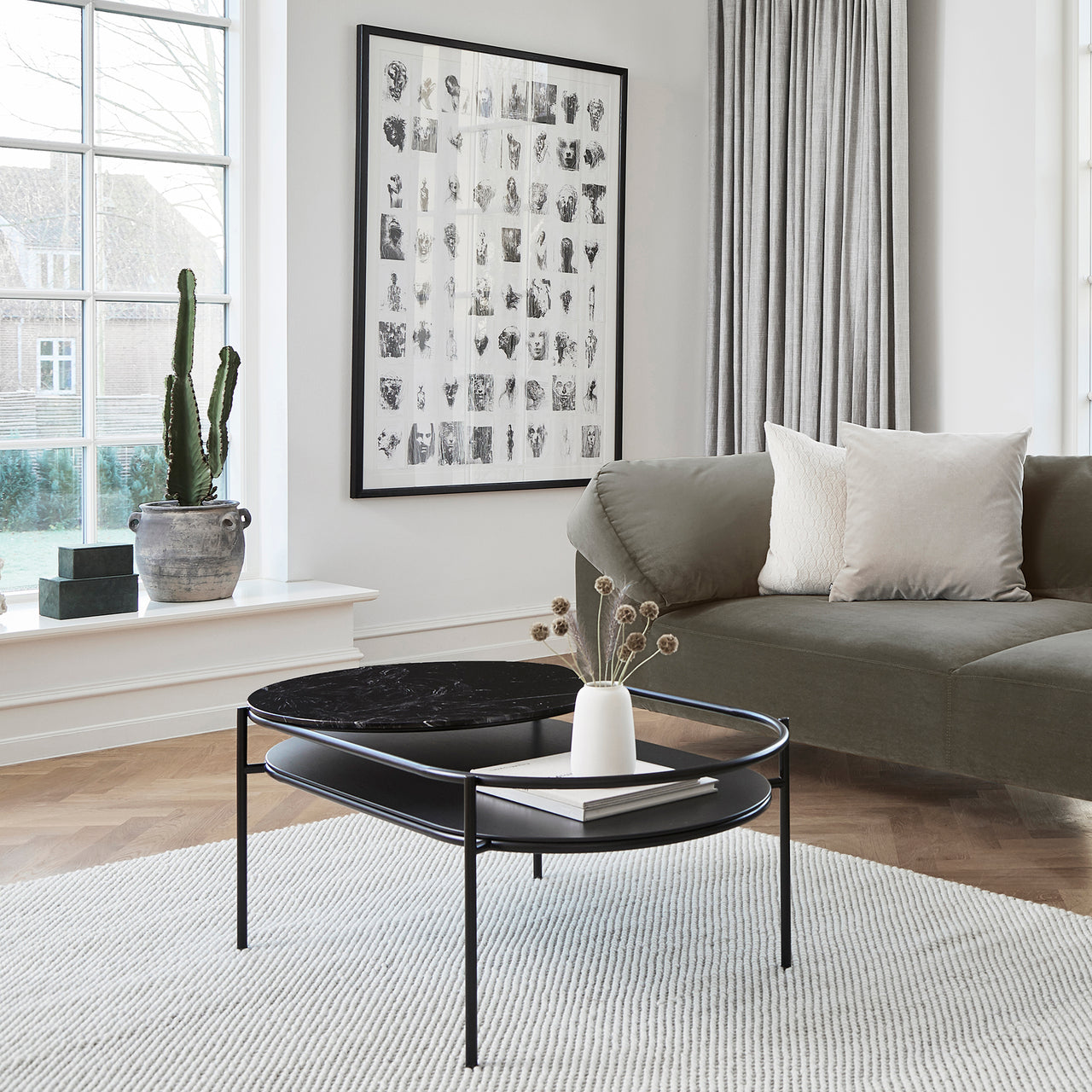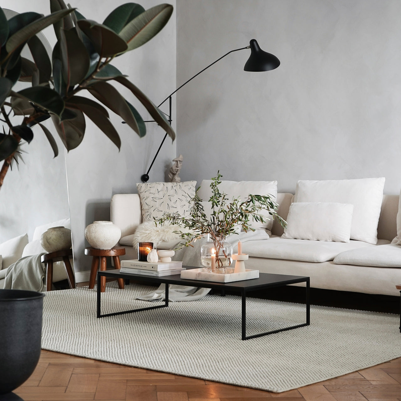 Tact is much more than a feast for the eyes. With woven loops that form a surface of circular droplets, Woud's wool area rug also stimulates and pleases the sense of touch. And the thickly fashioned, soft expanse has a welcome sound-reducing effect. With its rectangular, area-defining shape, the range of sizes suits varied kinds of spaces—from underscoring a coffee table in a conversation area to providing a warm and sensuous tread beside the bed.