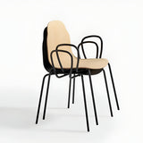 The Body Stacking Chair with Armrest draws inspiration from the human form, offering comfort and adaptability. Crafted from ash wood, its molded veneer structure showcases smooth, organic lines. The chair features stackable metal legs. This chair seamlessly adapts to diverse interiors, from dining areas to auditoriums.