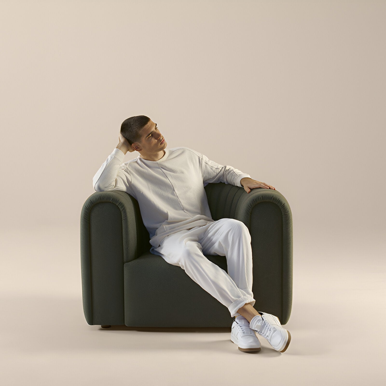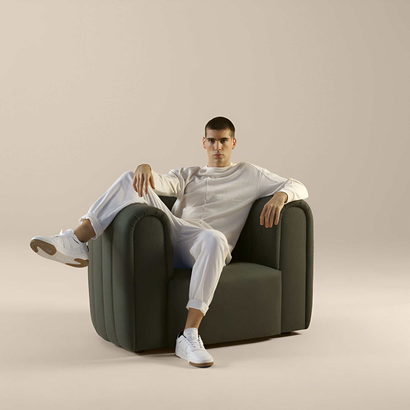 The Core Armchair takes inspiration from classic designs, featuring a spacious seat and a quilted backrest that provides a structured yet inviting feel. It has a fixed fabric cover over a sturdy wooden frame, cushioned with high-resilience foam for lasting comfort.