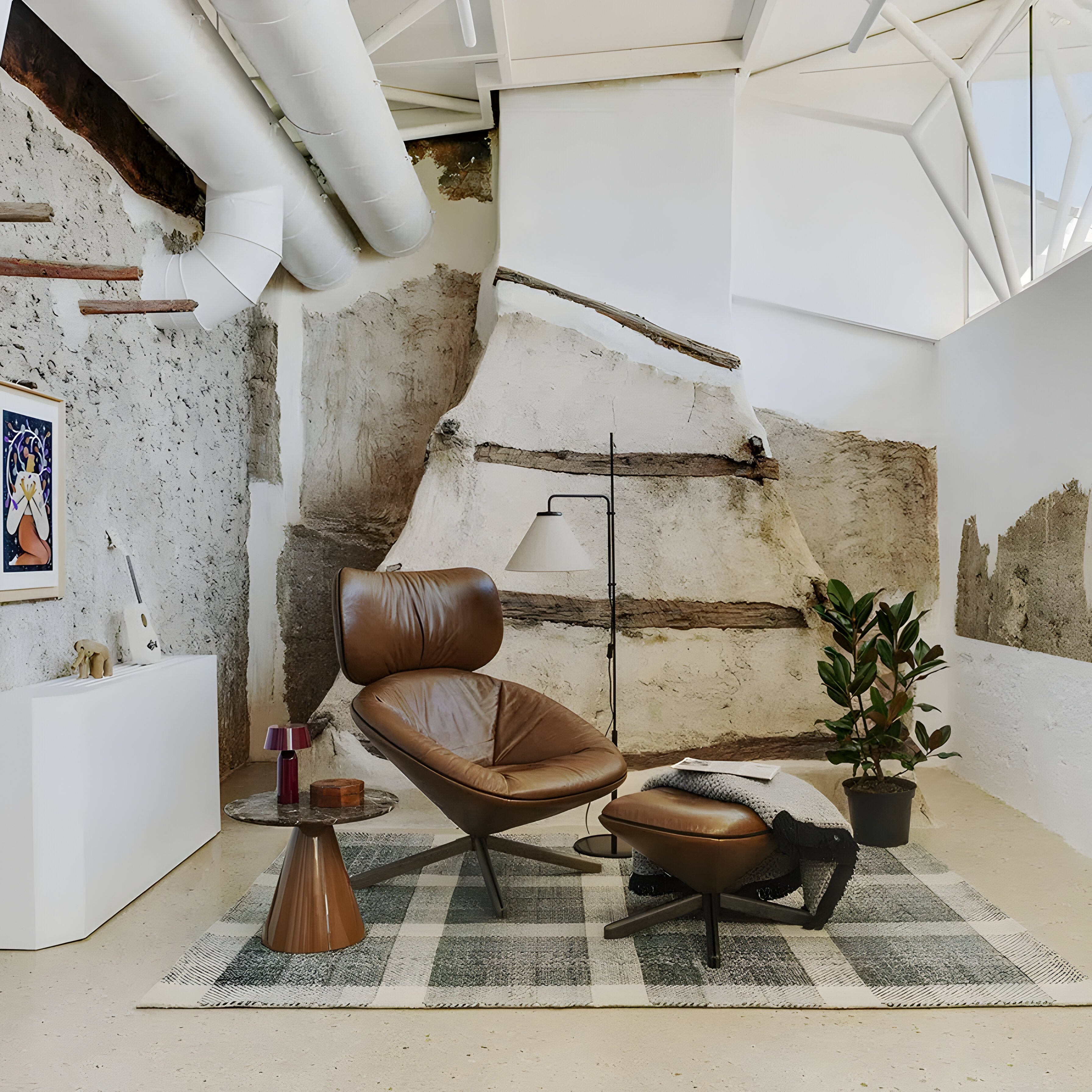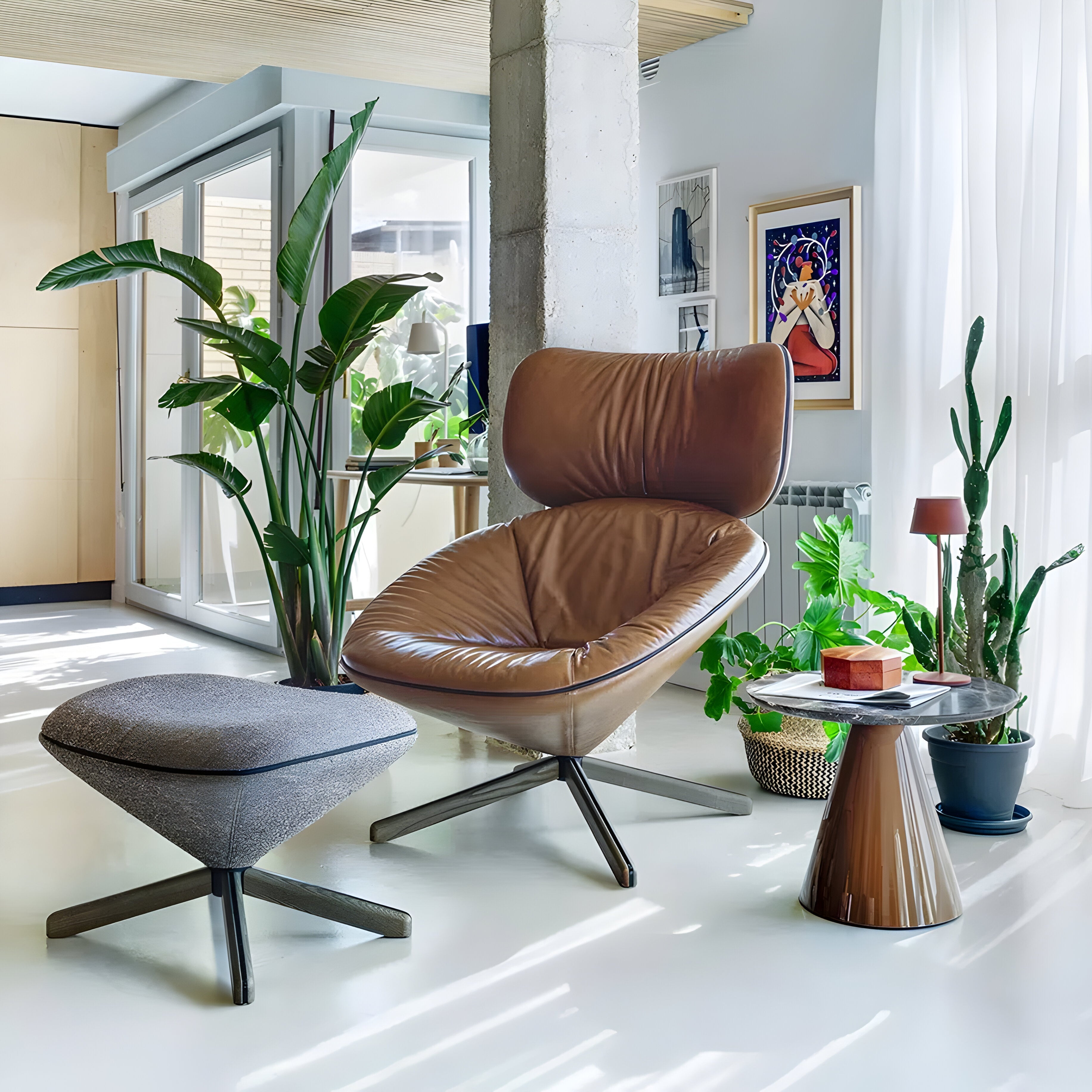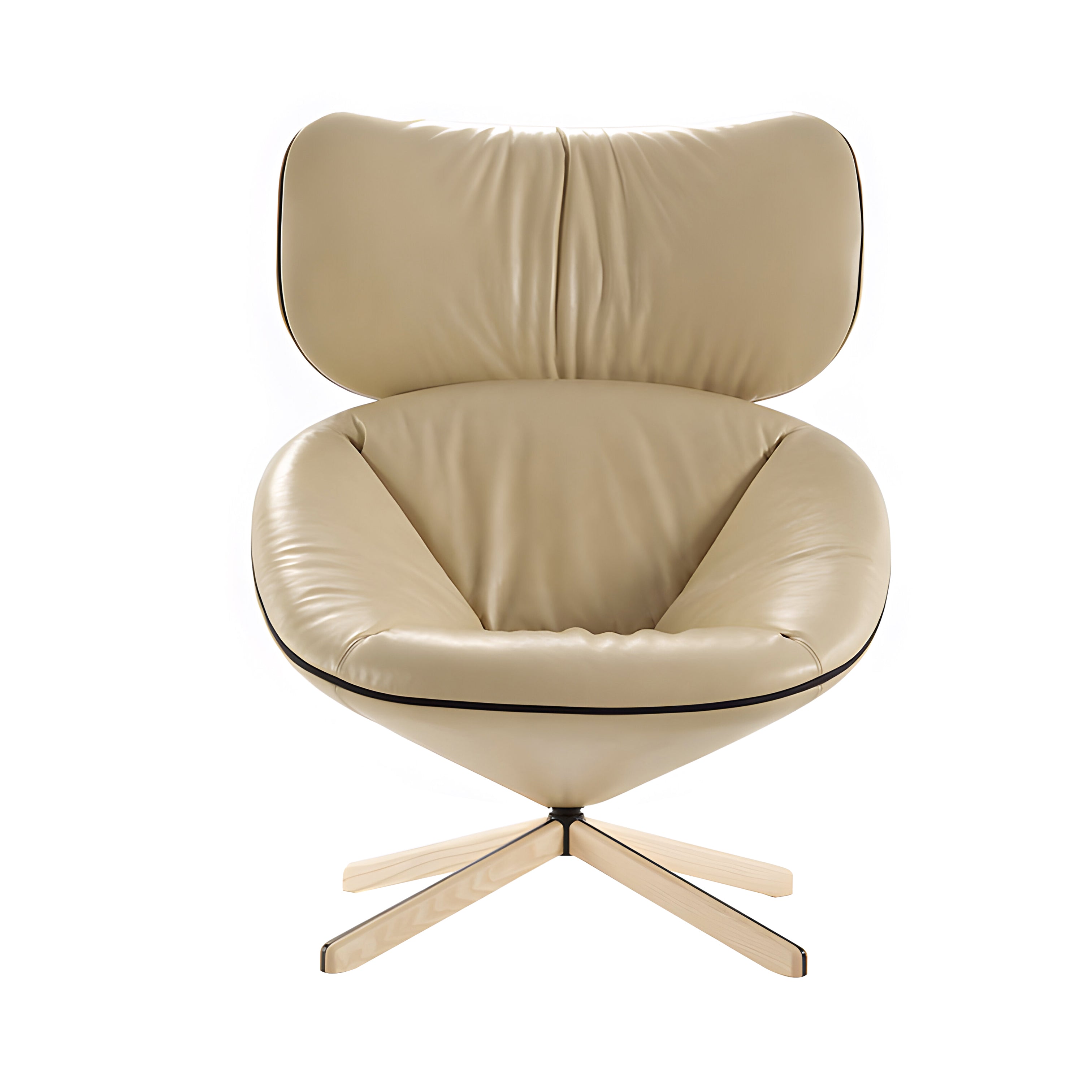 This armchair is designed for comfort, featuring a deep, concave seat that provides a supportive resting place. Made from injection-molded polyurethane and layered with quilted memory foam. An oversized headrest adds an extra element of comfort and privacy. The base includes wood detailing that can be stained in 3 different ash finishes. The collection also includes rotating lounge chairs, poufs, and tables for a coordinated seating arrangement.