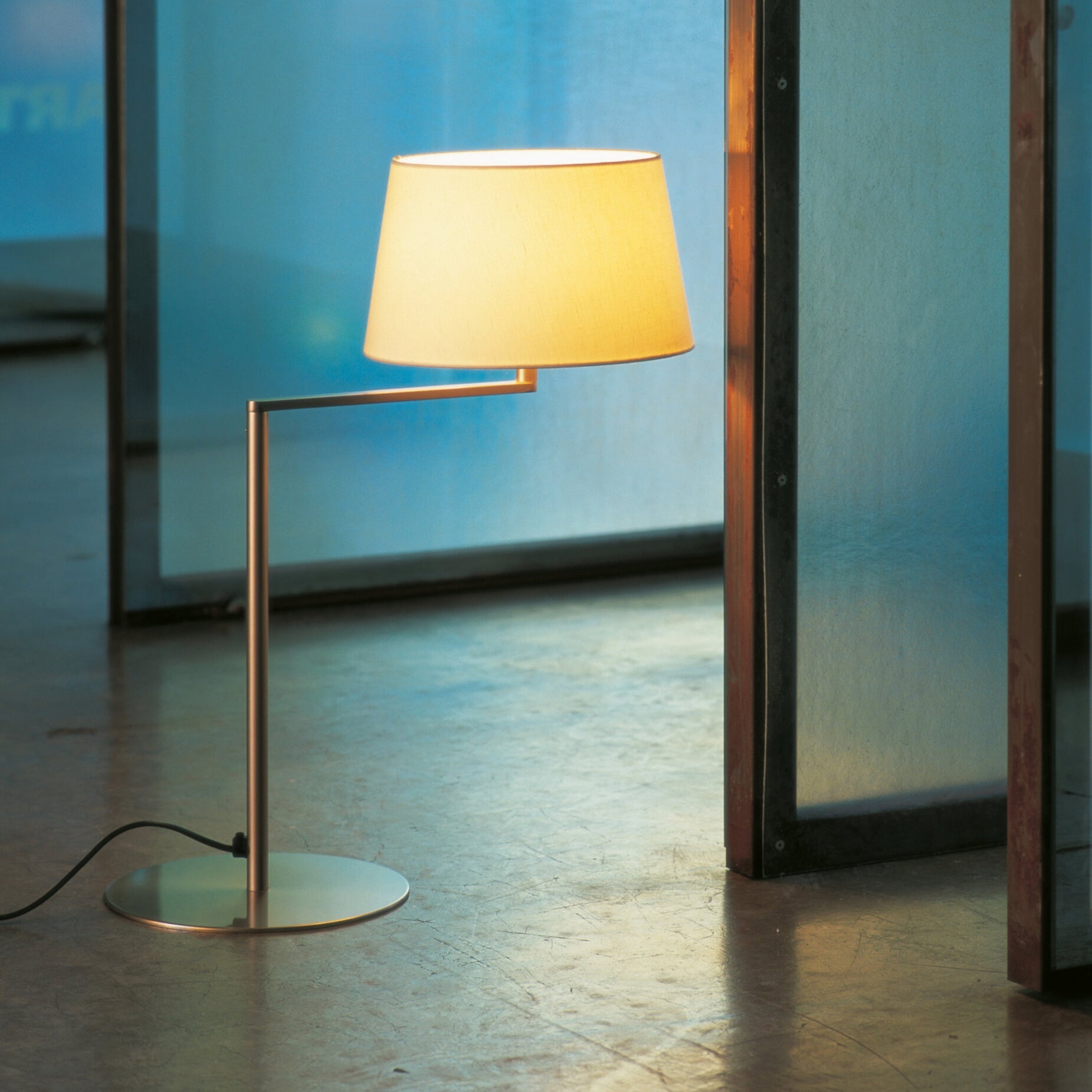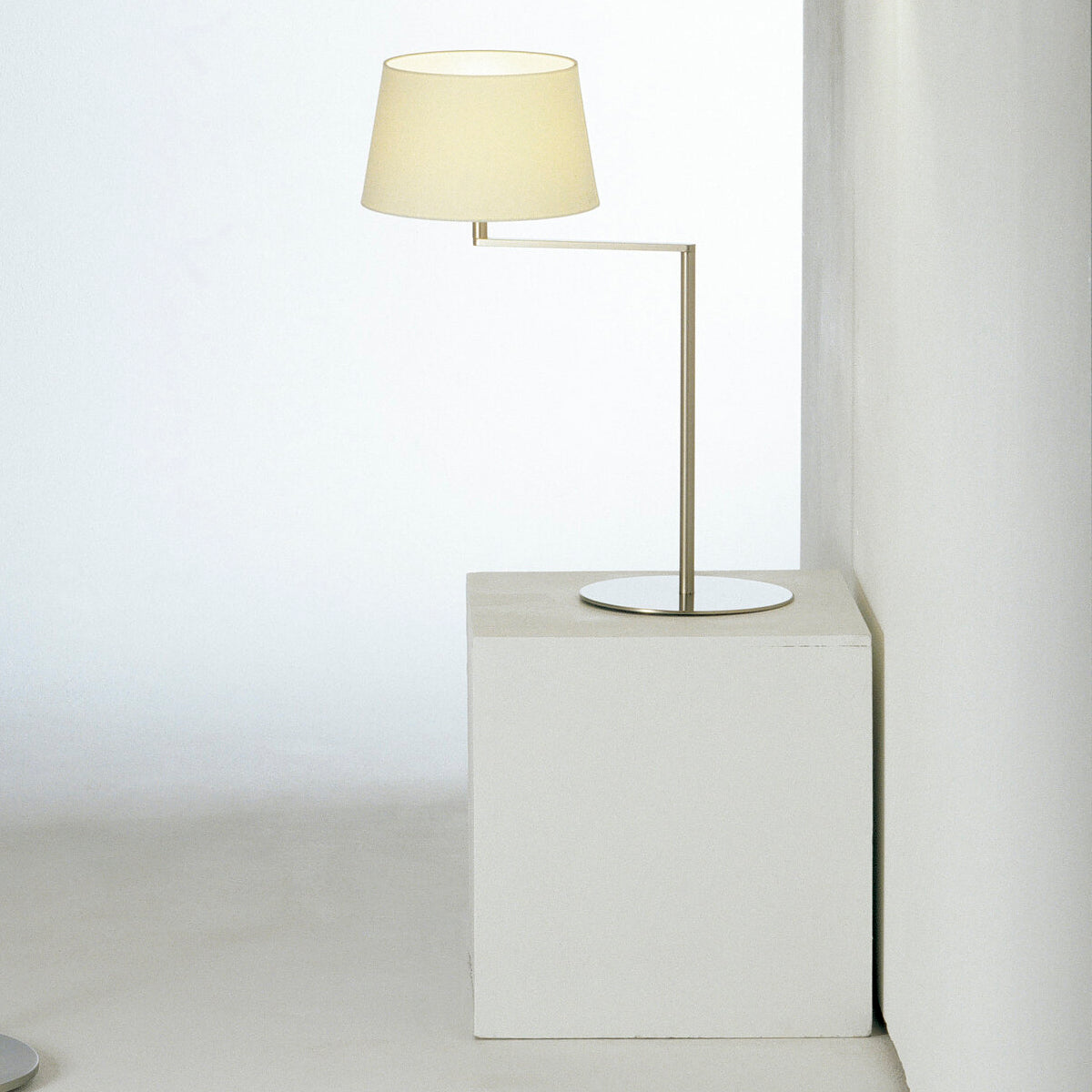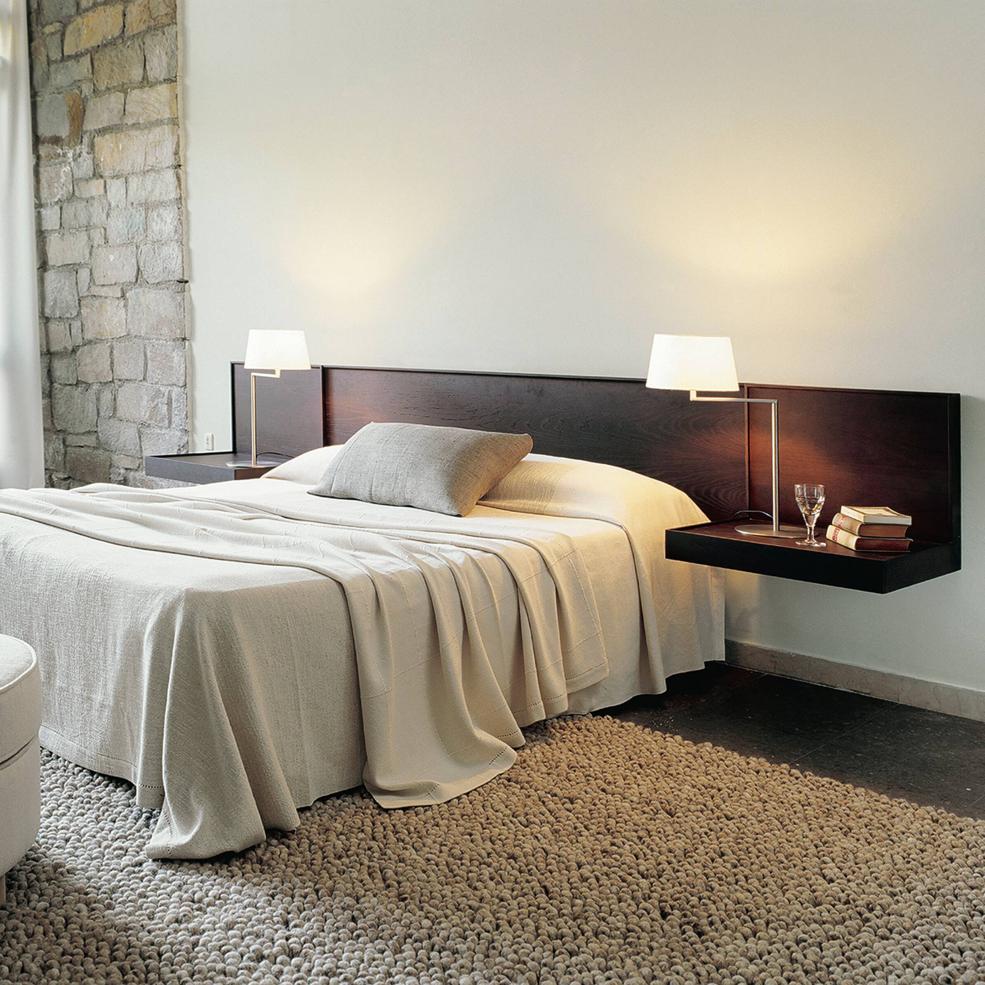In a handsome tabletop version, Americana revels in its timeless quality and functional design that lights the way for reading or intimate conversations. With a crisp white linen lampshade and satin-nickel structure, designer Miguel Milá's 1960s lamp series boasts newly updated LED illumination in tandem with its original rotating pivot. An admirer of George Hansen's swing-arm a decade earlier, Milá's streamlined version gently swivels the light nearer or further away.