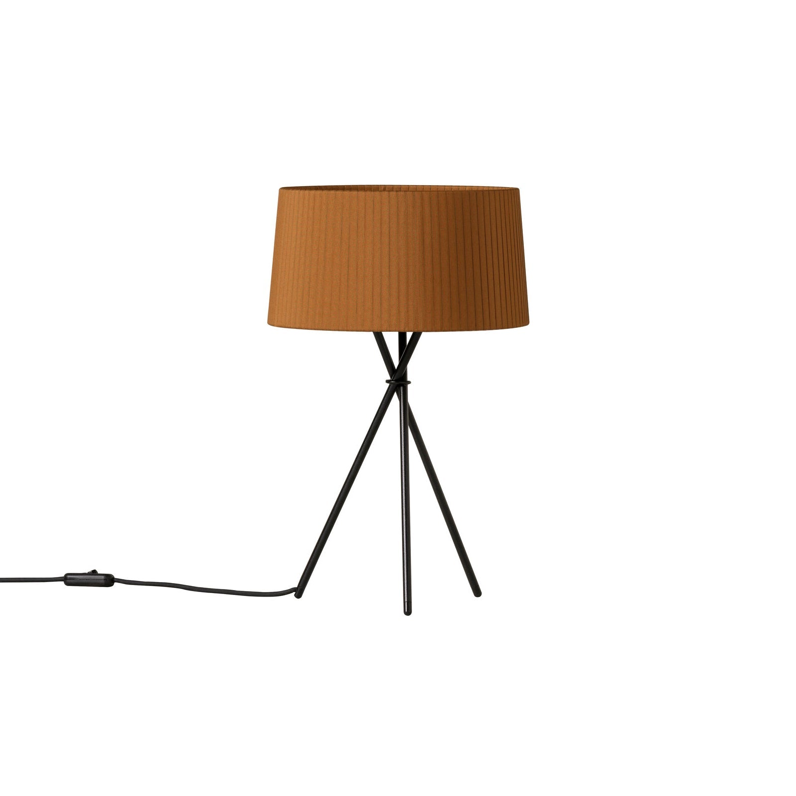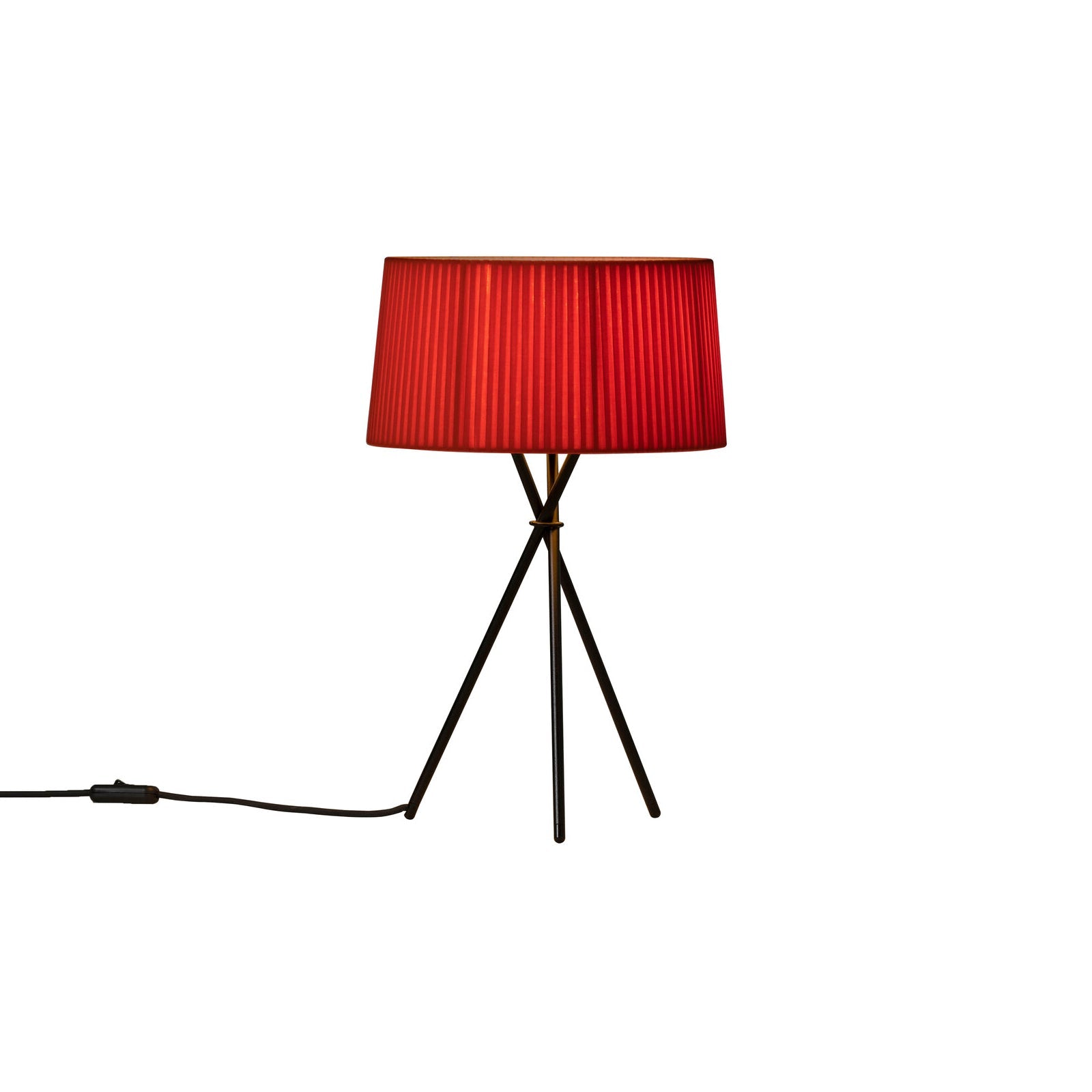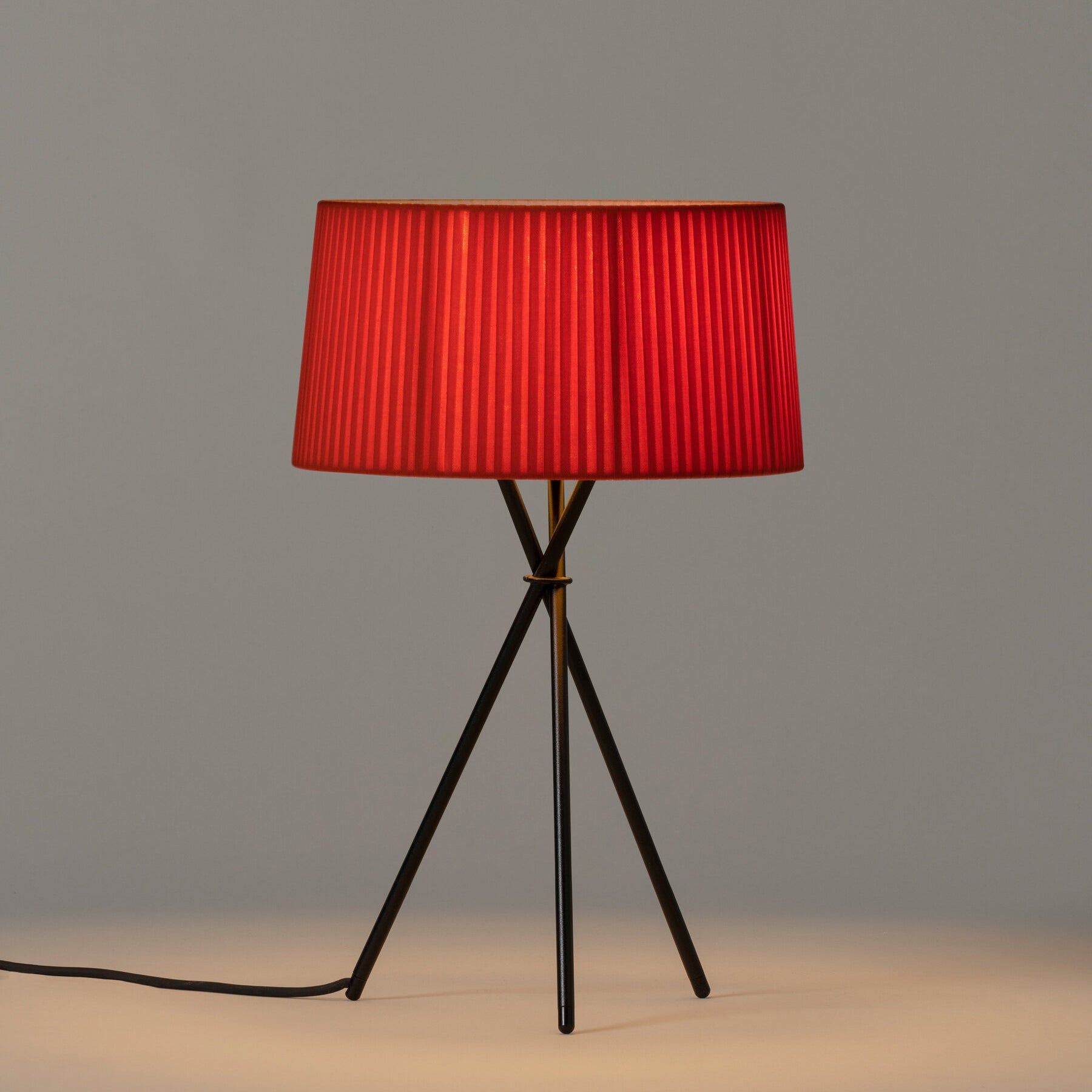 Santa & Cole scales down its sleek Trípode in an arresting table lamp version with the characteristic black metal 3-legged base and hand-fashioned ribbon shade. Available in 2 sizes, it emits a fully nuanced, warm illumination when turned on and serves as a sculptural statement piece when turned off. Each shade is handmade in neutral natural or black or a range of distinctive colors including terracotta, mustard yellow and forest green in a collaboration with Dutch studio Raw Color.