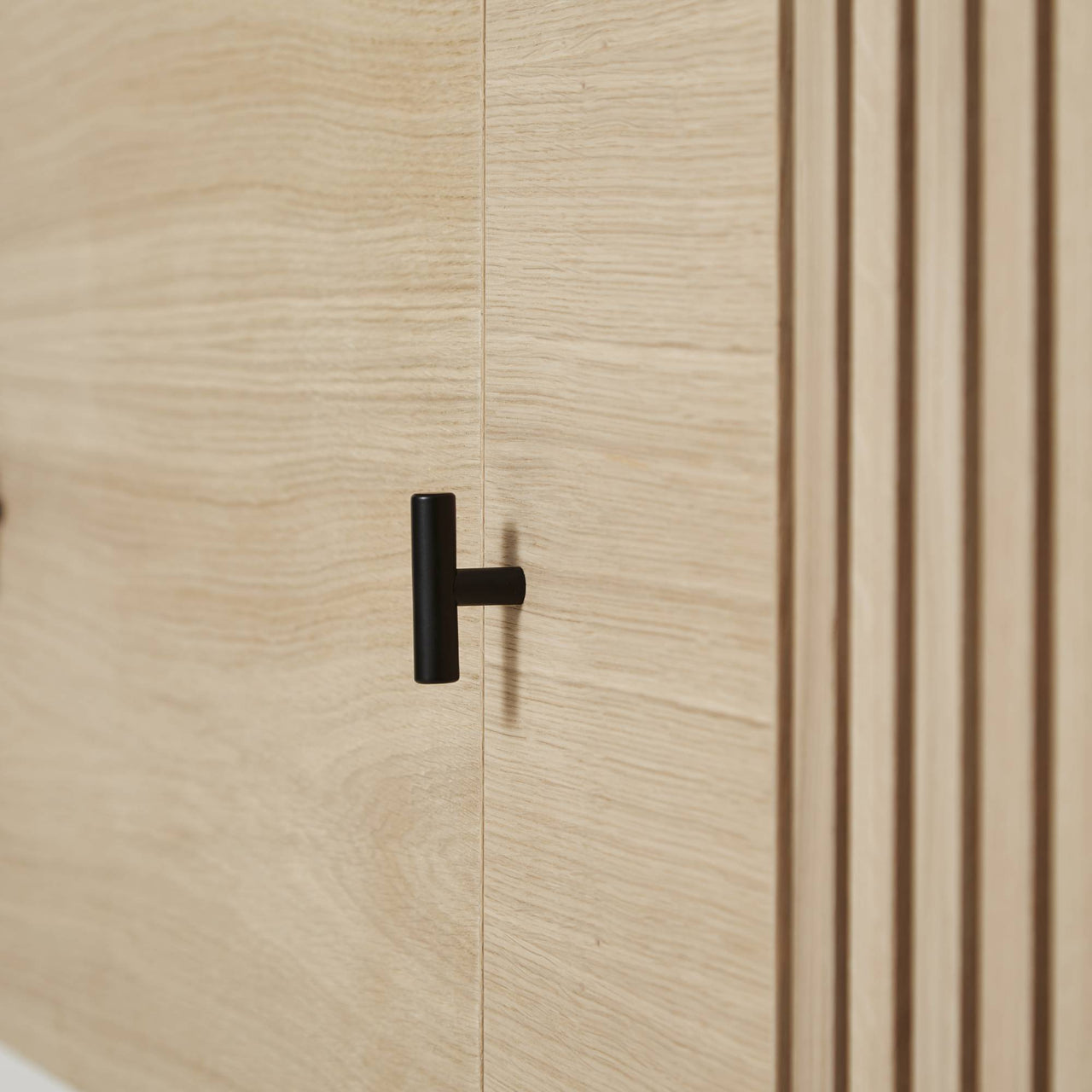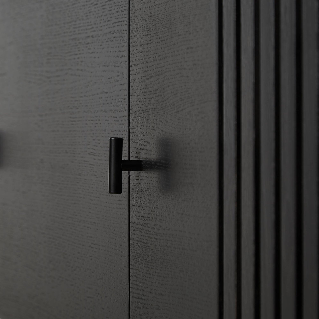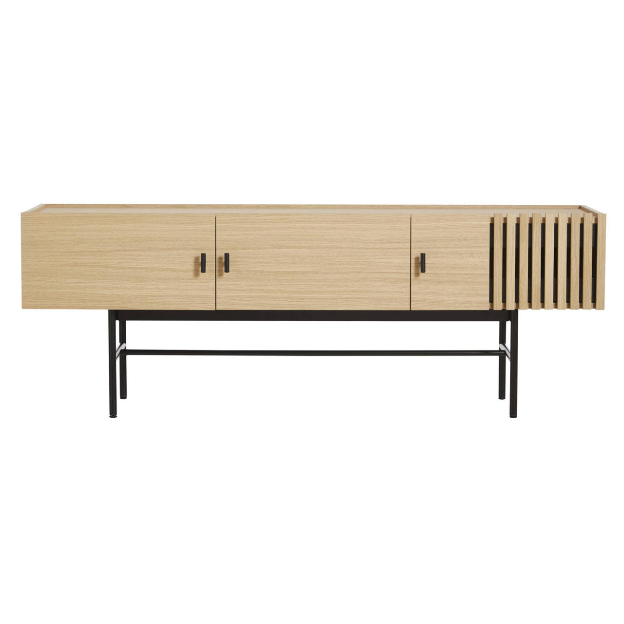 Inspired by slatted wooden cladding found in modern architecture, Array adds a low-slung, extended version of its asymmetrical sideboard. Danish design studio Says Who creates a strong visual effect from the play of light and shadow across the front surface. Fashioned in solid oak with a choice of white pigmented lacquer or black painted finish, the cabinet rests on a geometric metal base. Generous storage space inside and soft-closing doors make the piece both functional and beautiful.