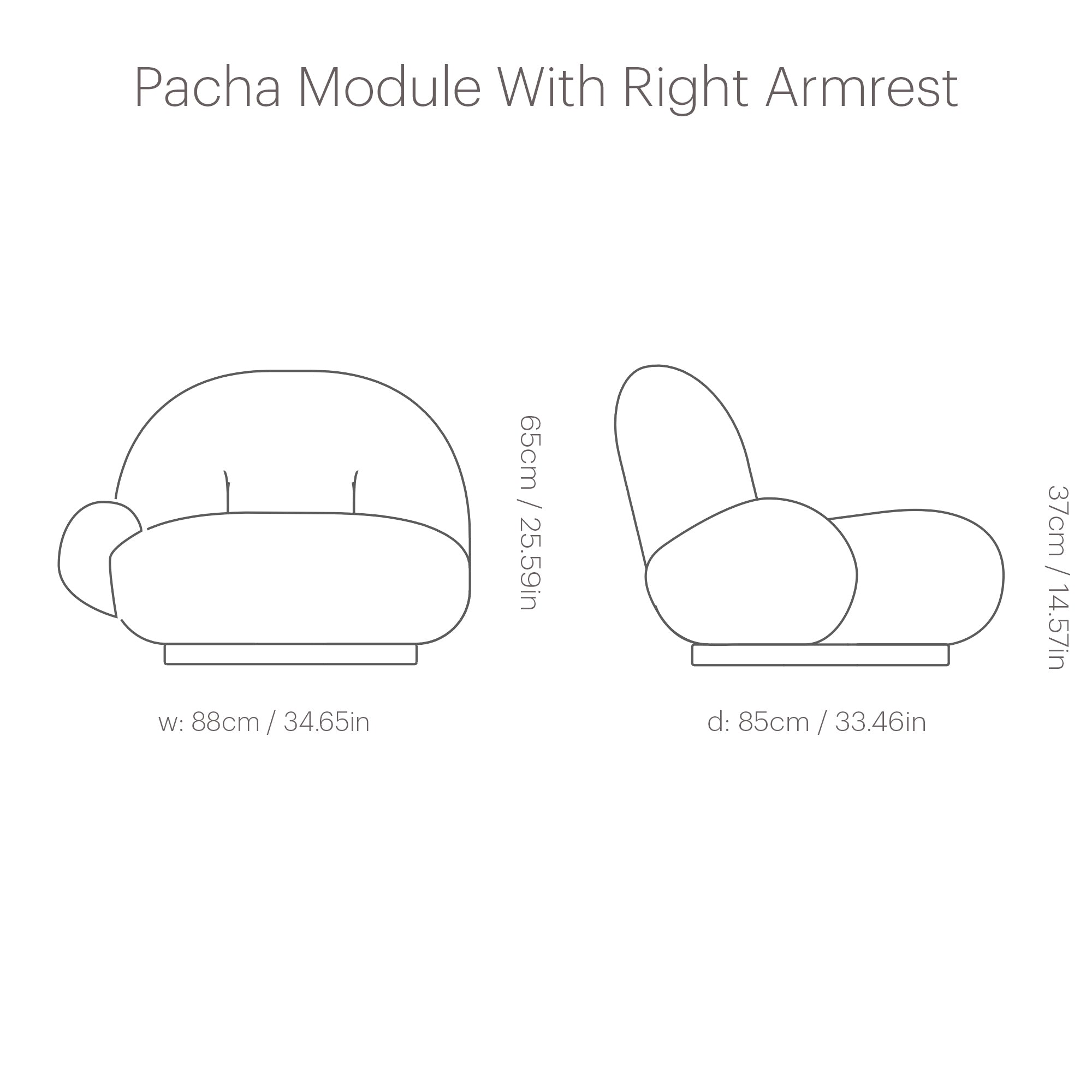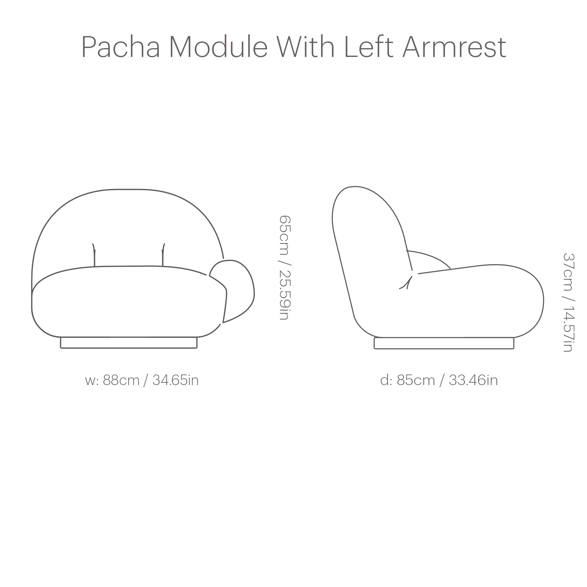 • Left & right armrest: 25.6" h x 34.6" w x 33.4" d (65x88x85cm)