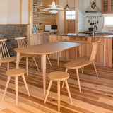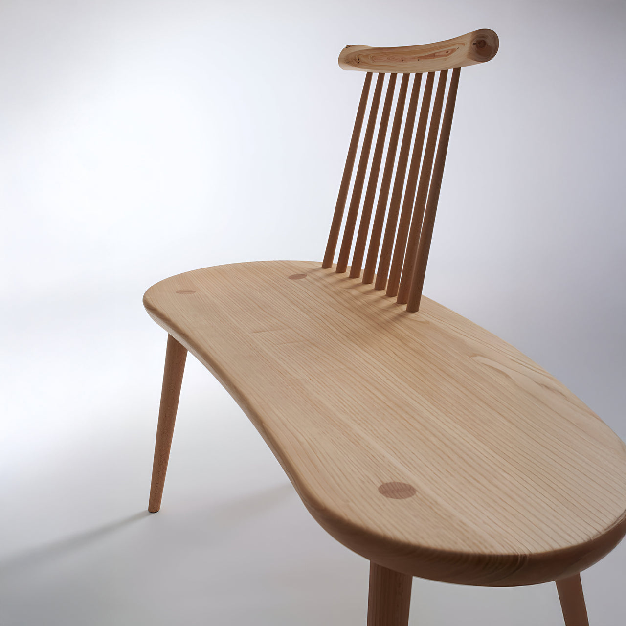 The Kinoe Bench features a top rail made from natural Japanese cedar or Hinoki (cypress) branches, giving each piece a unique shape and texture. The seat is crafted from Japanese chestnut, and the legs and spokes are made from Japanese beech. This design makes use of materials that might otherwise be discarded, highlighting the beauty of natural forms.