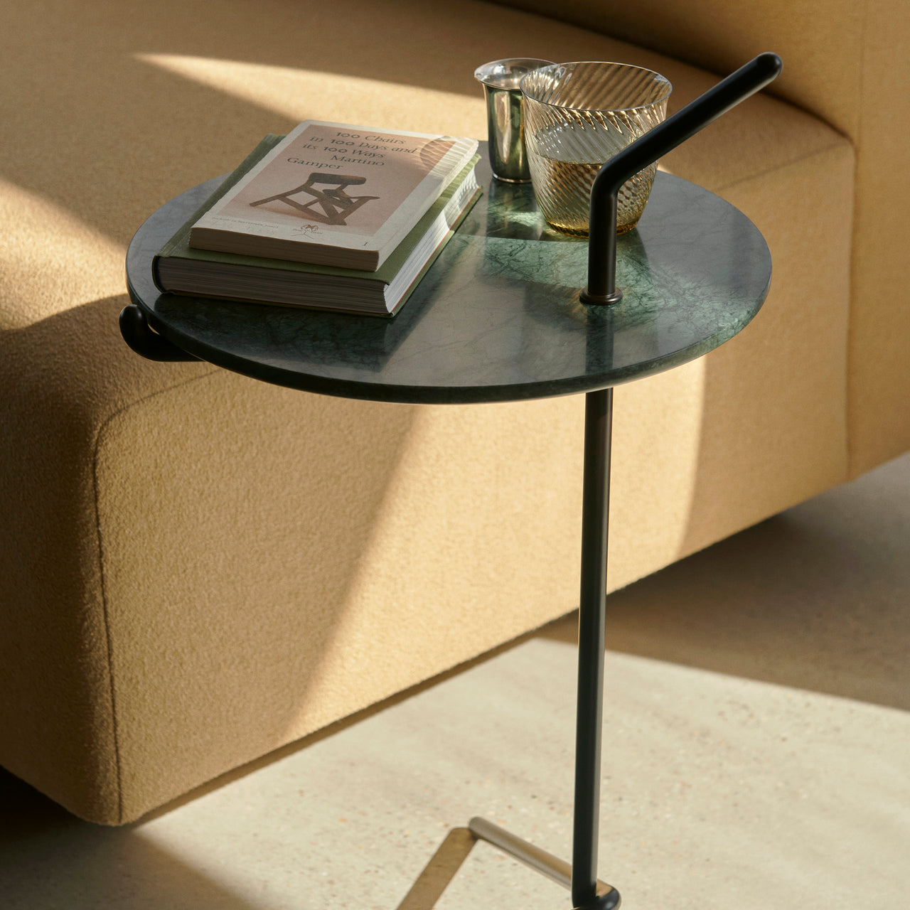 The Halten SH9 Side Table, designed by Sebastian Herkner, is built with thoughtful precision and emphasizes material contrasts, combining a sturdy base with a top that brings warmth and subtle texture. This variation features a marble top. From living rooms to lobbies, this table serves as both a practical surface and a decorative element. Available in warm black or polished stainless steel, the SH9 maintains a focus on high-quality materials and careful detailing.