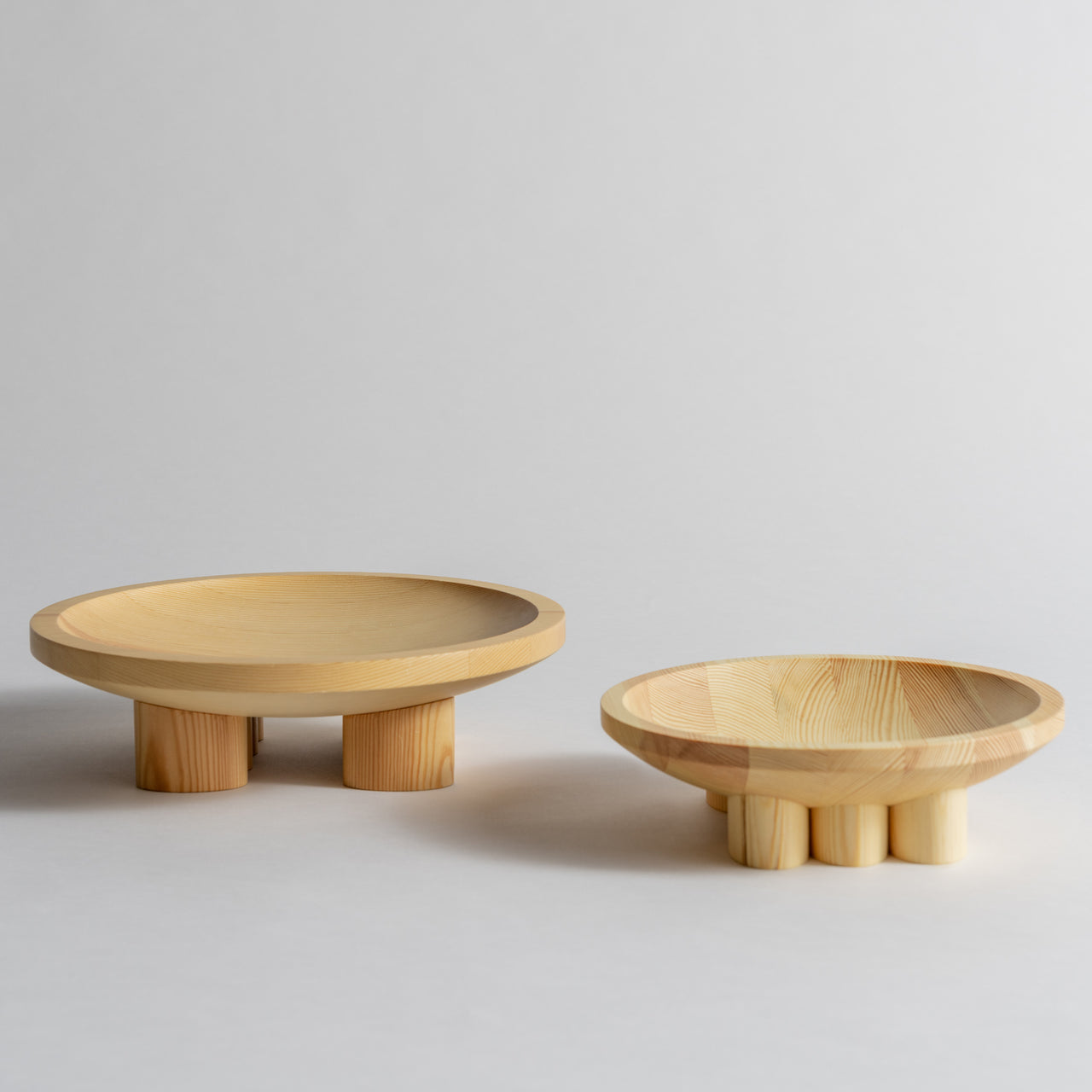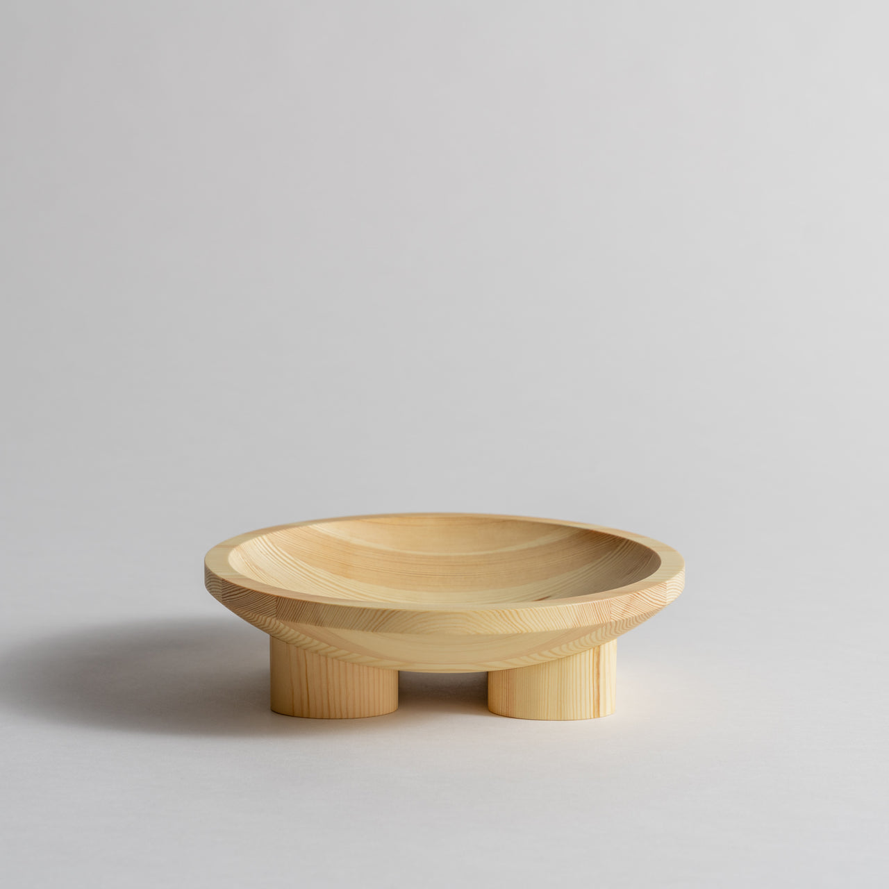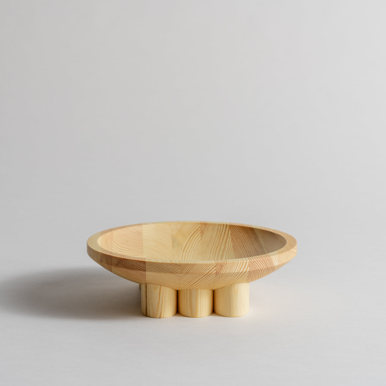 The 008 Bowl is a sturdy pinewood piece designed by Mac Collins, featuring a shallow bowl elevated on thick legs to achieve a low center of gravity. This design highlights the natural qualities of Finnish pine, showcasing a combination of straight lines and curves, as well as horizontal and vertical grains. Over time, the pine matures into a rich honey tone, with natural dents and bruises adding character and evidence of life lived.