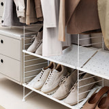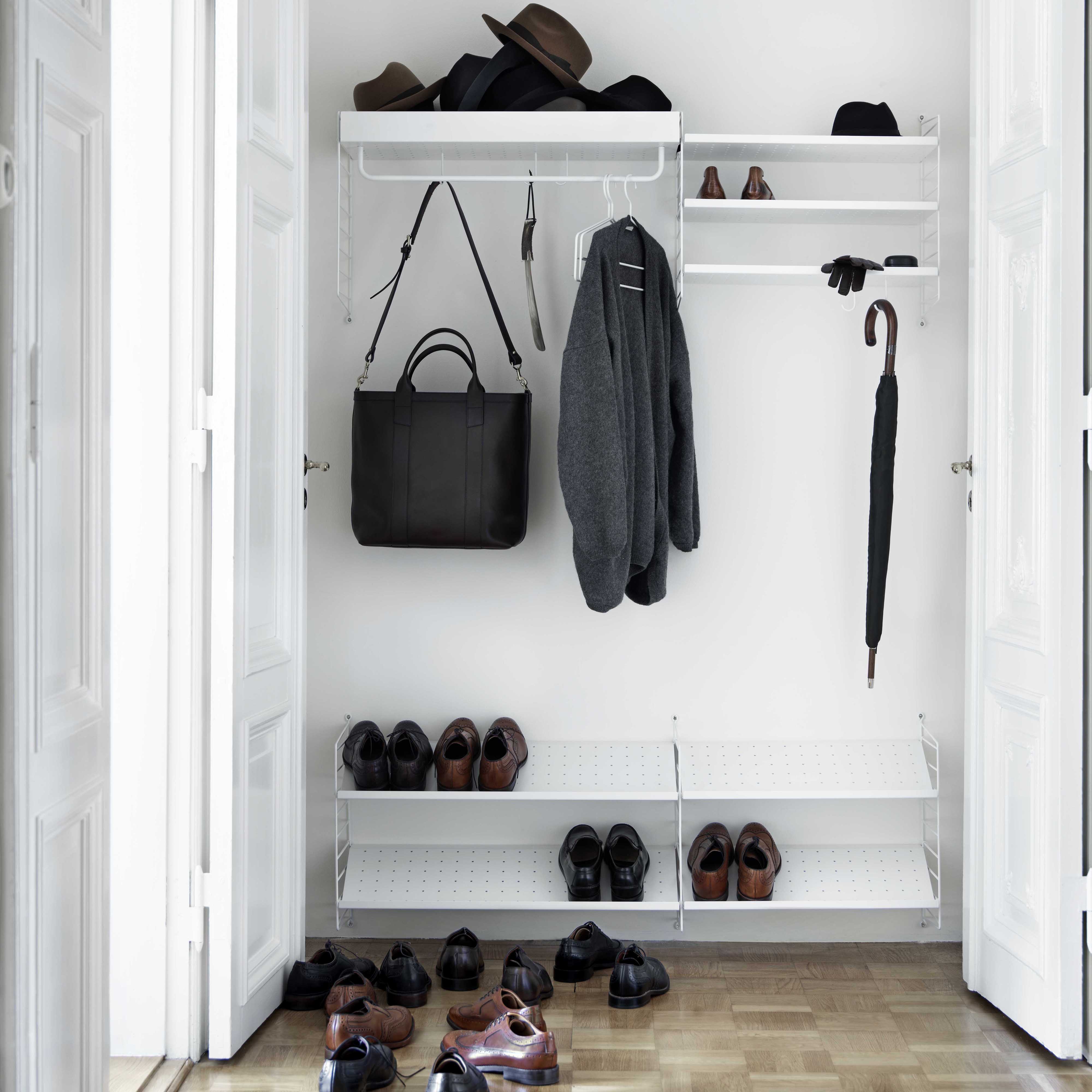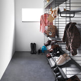 String has everything needed to kit out a medium-sized bedroom with this single-bay clothing storage. The preconfigured unit features a clothing rod, metal shelves up above with high and low edges for storing accessories and slanted shelves below for shoes. In fine-textured steel with a powder-coat finish in the familiar coated-wire structure, the unit also accommodates String add-ons like organizers, coat hangers and extra hooks (also available at A+R.) And it's infinitely expandable as needs grow and change, an enduring feature of Nils and Kajsa Strinning's 1949 modular concept.
