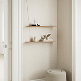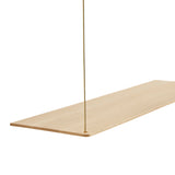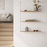 The Stedge Shelving Anniversary Edition is a minimalist shelving system featuring exclusive brass wires that enhance its refined appearance. The design creates an illusion of floating shelves, with thin oak surfaces appearing to be held in place by a single, delicate brass wire. In reality, the shelves are securely attached to the wall with screws and supported by two connecting metal wires, ensuring stability. Its light and airy structure makes it an ideal choice for minimalist interiors, providing functional storage without overwhelming the space.
