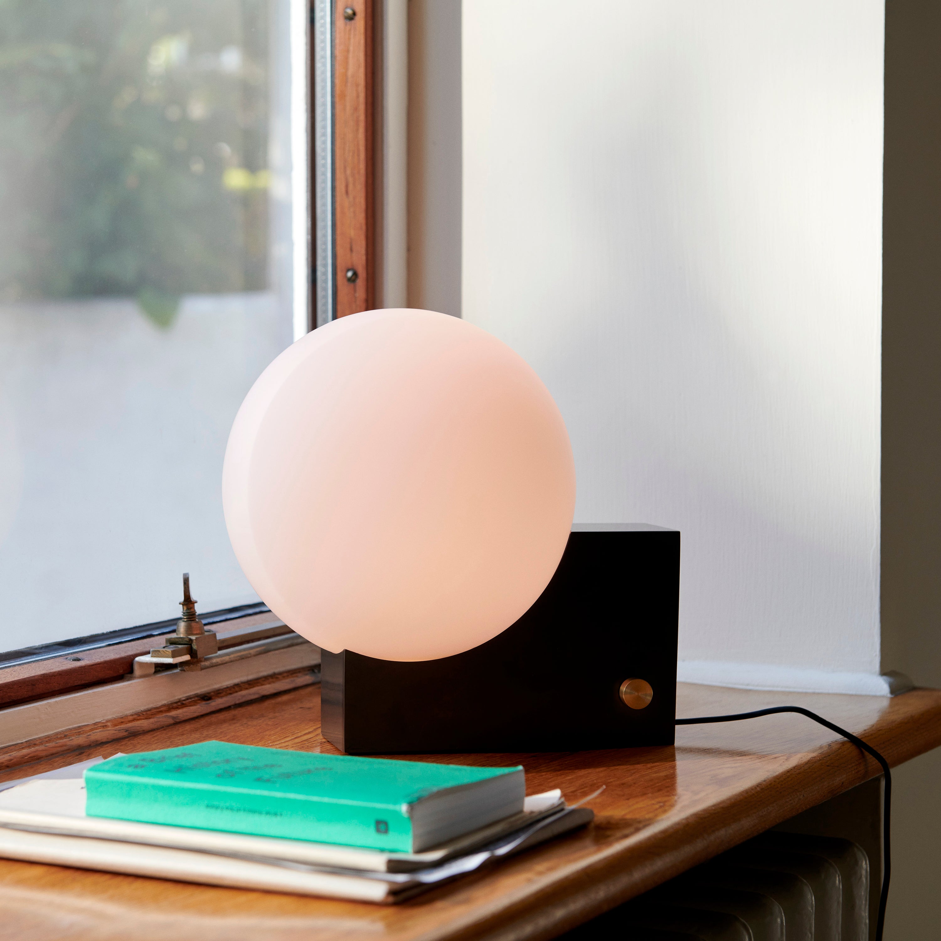 Opposites attract, at least when viewing the harmonizing geometric shapes of a sphere and a rectangle in &Tradition's Journey. Design manager Signe Hytte juxtaposes the lamp's mouth-blown opal glass shade with a squared-off base, available in mirrored chrome to catch the reflections, graphic matte black or a warm clay tone. To place on a table or hang on a wall, it also has a fully dimmable function for the permanent LED light module—to summon just the mood that's desired at any time.