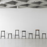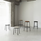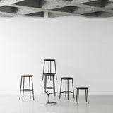 You could say designer Simon Legald goes full circle with his utilitarian-chic black tubular stool in either bar or counter height. Circa harkens back to classic minimalism with its recurring round motif found in the distinctive circular shape of the seat with a handy hole in the middle for moving it around and also repeated in the footrest. With its trim steel base in black powder-coated steel, the seat choices number natural or black lacquered oak veneer as well as aluminum.
