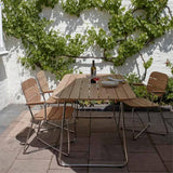 Even with a small armrest for added ease, this Lillium variation still slides easily underneath the table. Design studio Bjarke Ingels Group took the idea of a slatted outdoor chair that lets rainwater drain off from seeing an old disassembled schnapps barrel. The chair's X-shaped metal frame provides stability while also allowing for a bit of comfortable "give" when seated. Fashioned in solid FSC-certified teak and stainless steel to stand up to the elements, the untreated wood seating develops a prized grey patina over time.