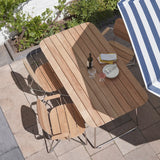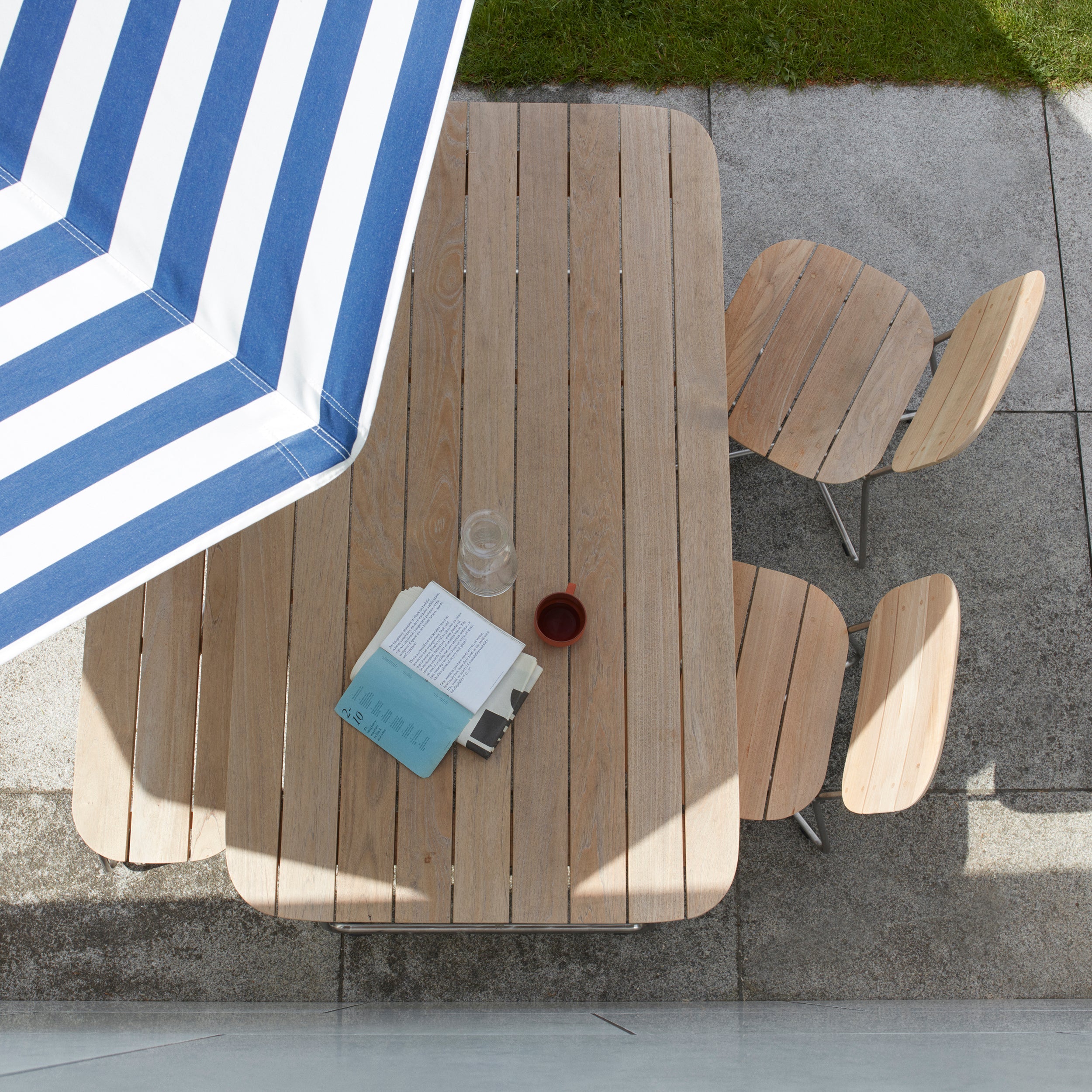 Lilium means "Lily" in Latin—and the name comes from the collection's rounded outline resembling a lily pad, as seen in the tabletop of this capacious dining table. The light but strong construction starts with a slender frame in stainless steel with an airy and unobtrusive character. With the tabletop in golden teak (that will eventually weather to a wonderful silvery-gray), designers at BIG situate the planks lengthwise to make the table look even longer and more welcoming.