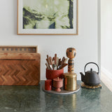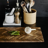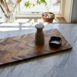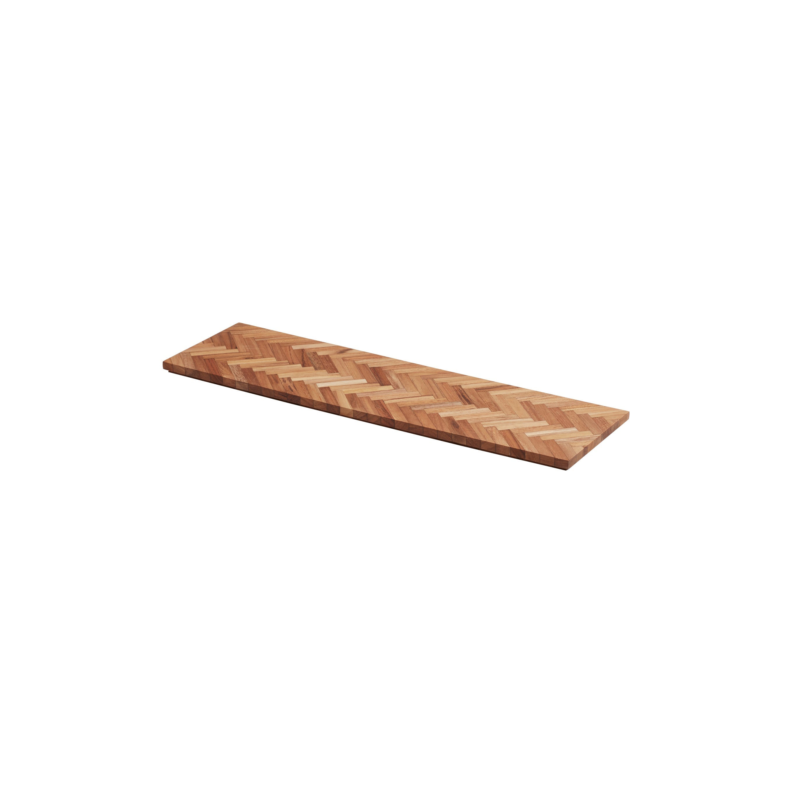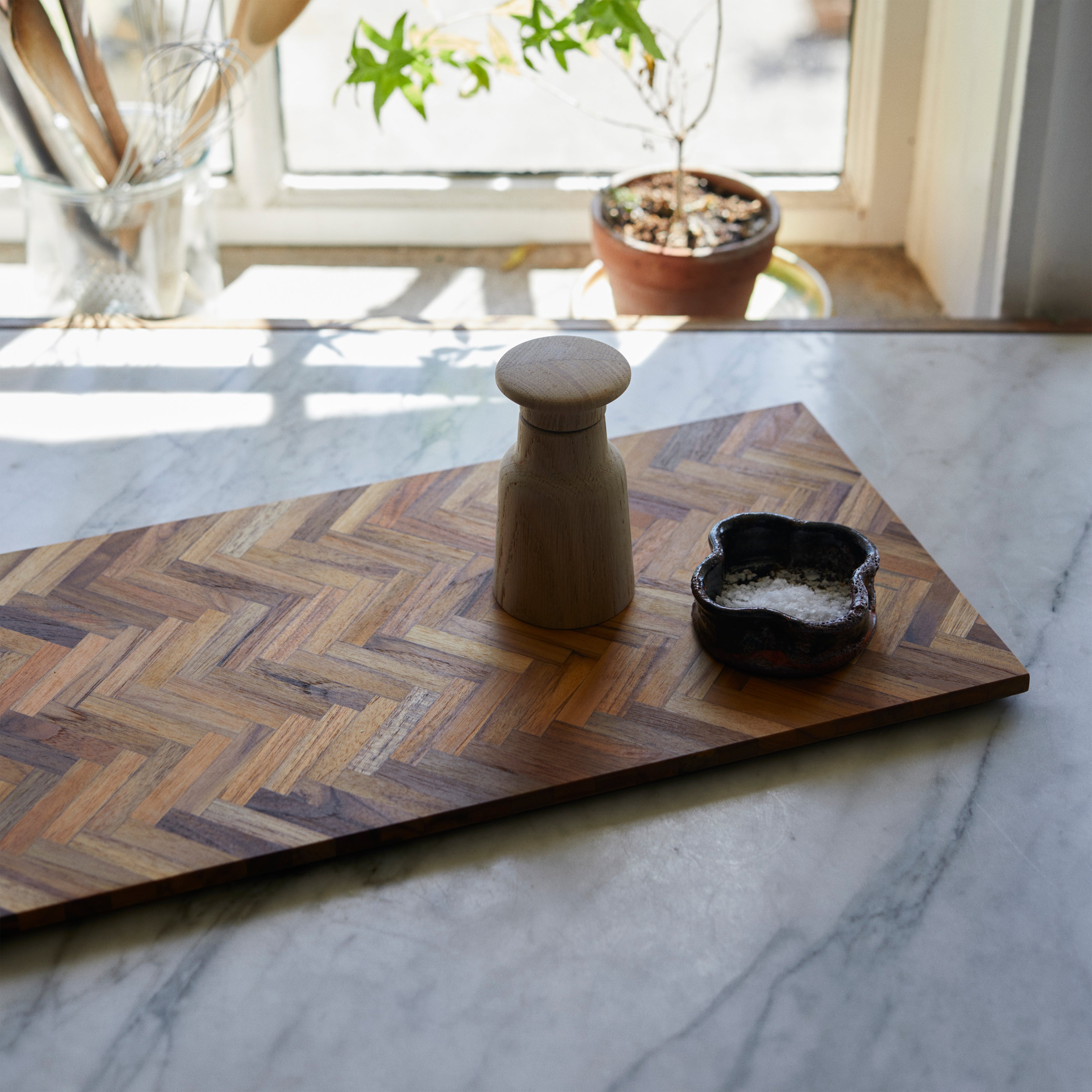 Designer Søren Refsgaard introduces Sild, a tray that functions as both a cutting board and an implement for serving at the same time. An elegant composition of small wooden pieces in teak forms an elegant herringbone pattern which emphasizes the many nuances and grains in the sustainably sourced wood. Sild means “herring” in Danish, which makes a nod to its Nordic roots.