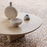 The Albio Coffee Table features an irregularly rounded top set on a faceted triangular base, creating a sculptural presence. Available in finishes such as Travertine marble, wood veneers, or lacquered colors, it offers a range of choices to fit various settings. Designed by Skrivo, the table combines organic shapes with geometric details and is available in 3 sizes.