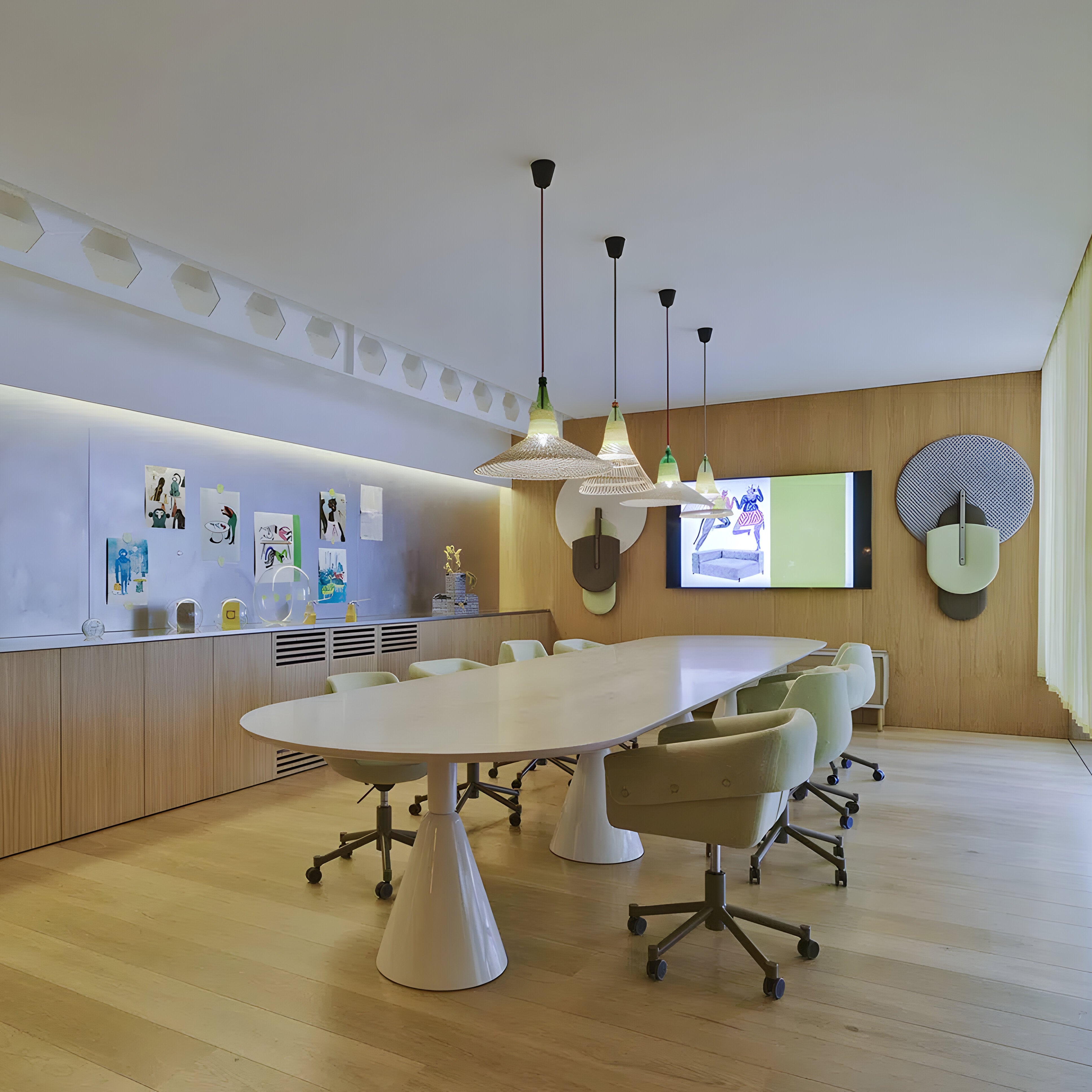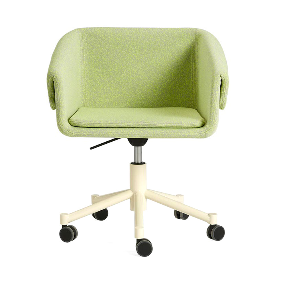 Taking inspiration from the folded form of a shirt collar, this chair combines a molded foam interior with a steel frame for lasting support and comfort. The upholstered seat includes a removable cushion cover with CMHR, and the matching buttons and piping reflect careful detailing. A height-adjustable gas piston and five-star lacquered steel base offer ease of movement, while silent wheels with high-resistance roller guides in nylon and steel allow for smooth, quiet gliding.