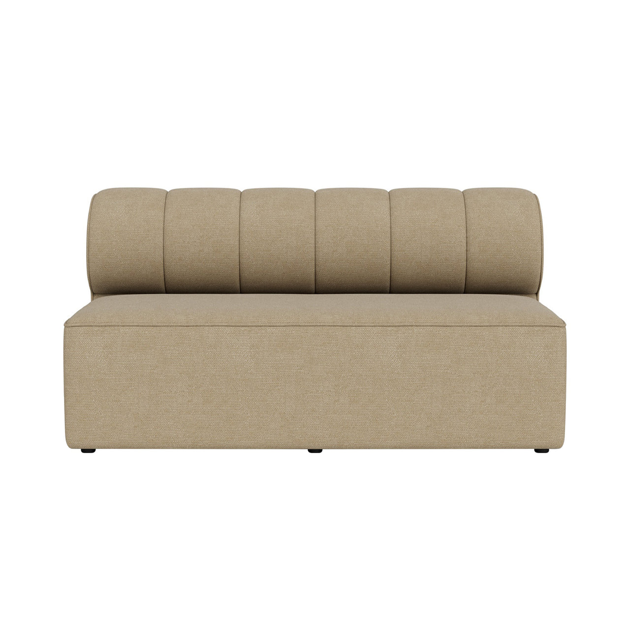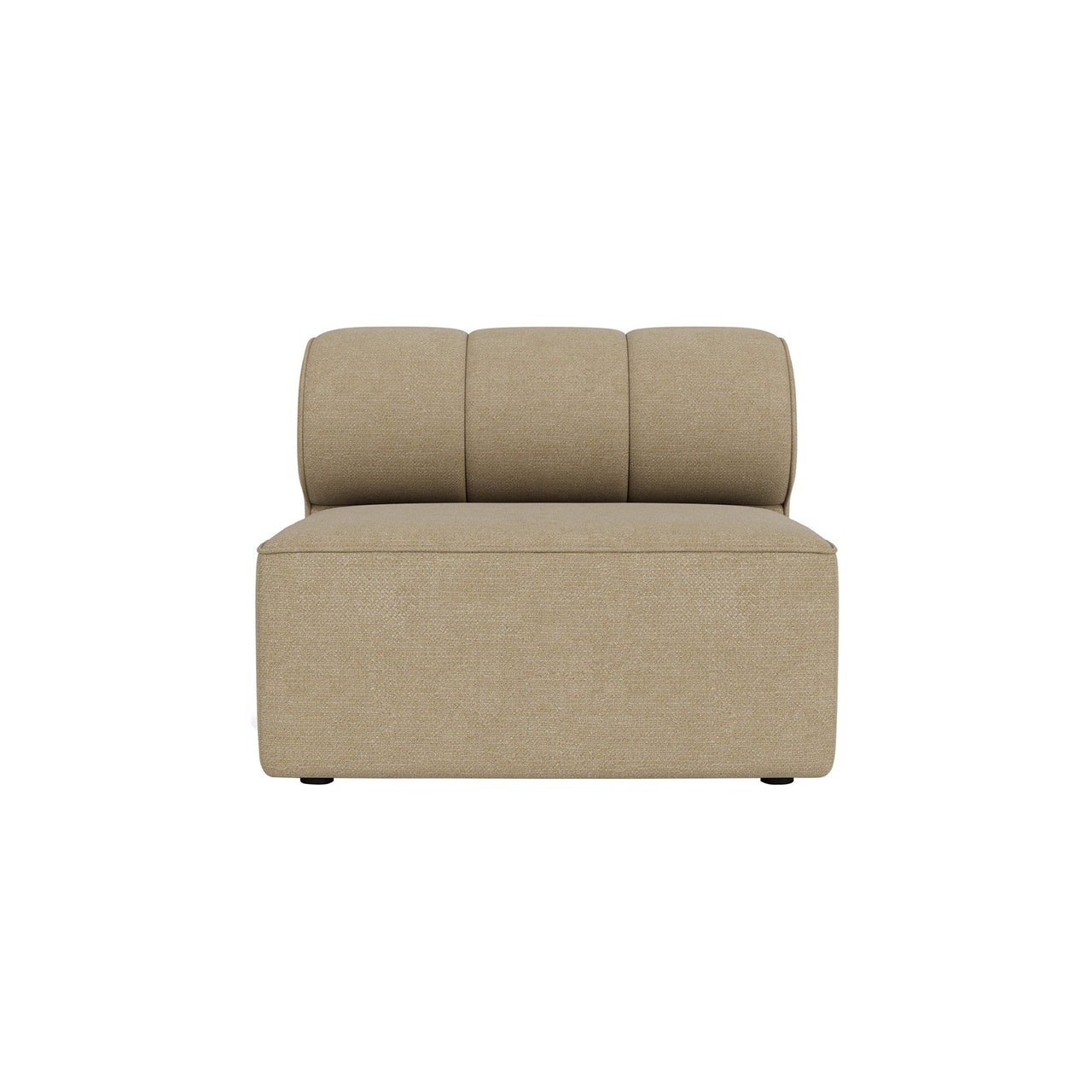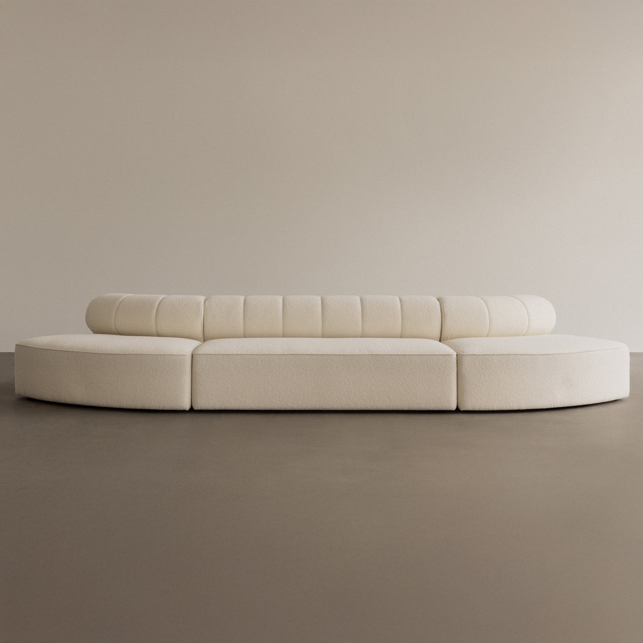 The Eave Seamline Sofa Open Section module functions as a central or connecting element in a custom sofa arrangement, featuring a broad rectangular shape with gently curved back and armrests for ergonomic support. Its neutral upholstery is accentuated by minimal stitching and curved seams, offering a subtle texture. Upholstered in premium materials like recycled cotton blends and wool, it delivers a cozy seating experience while maintaining a structured look that fits seamlessly into various settings.