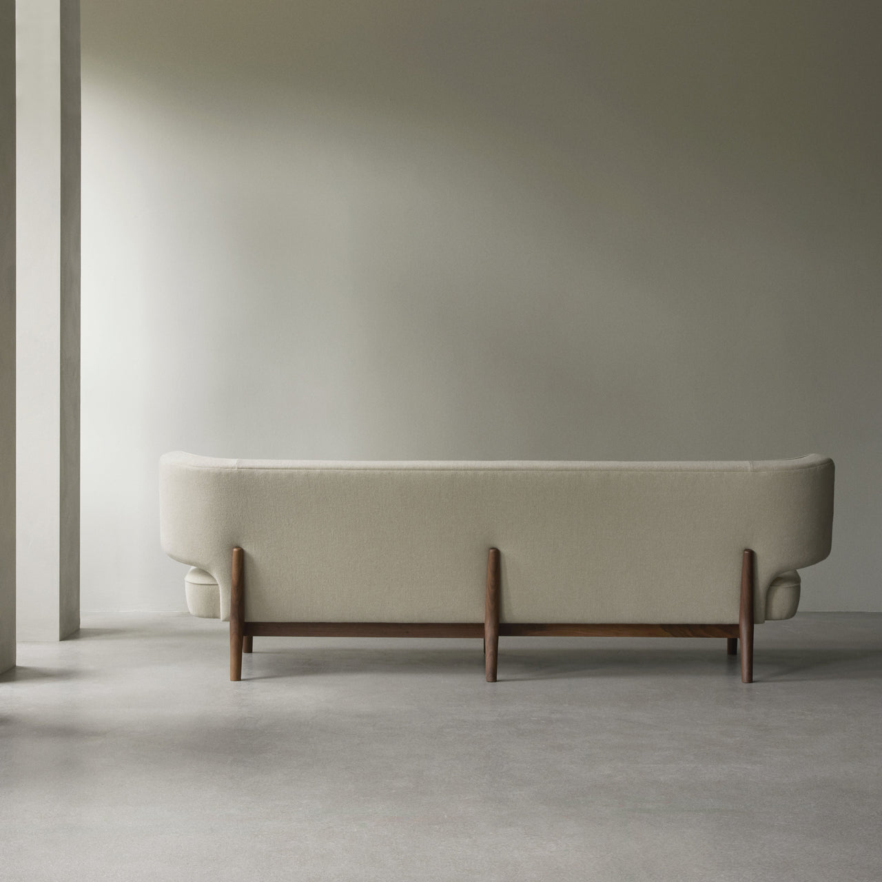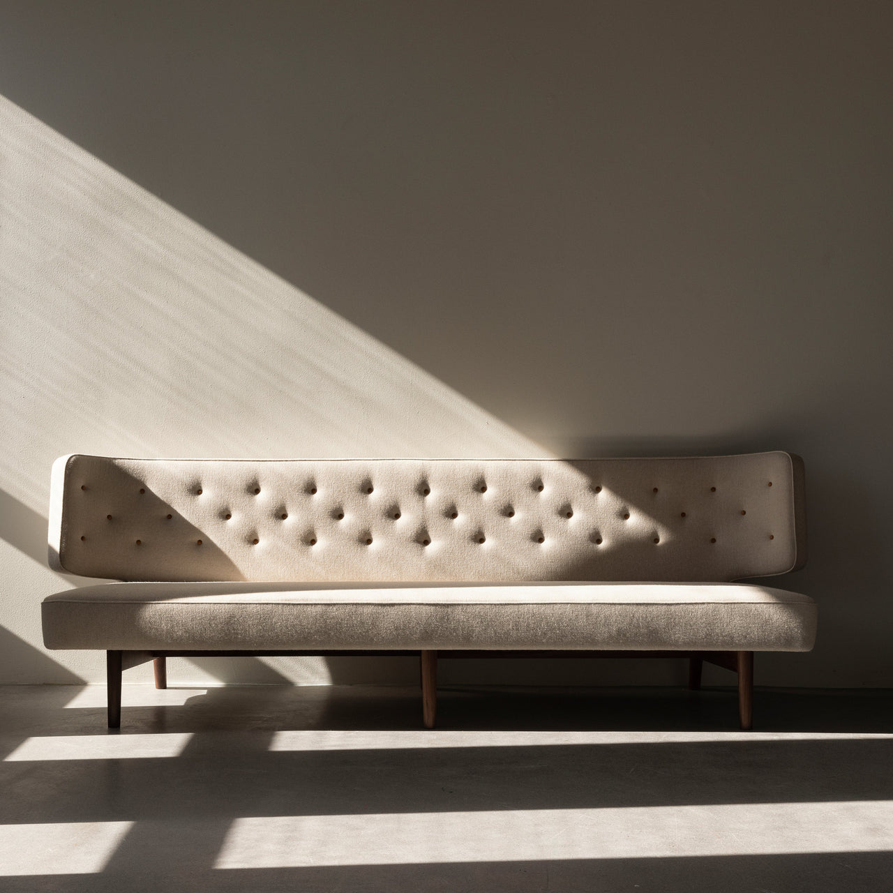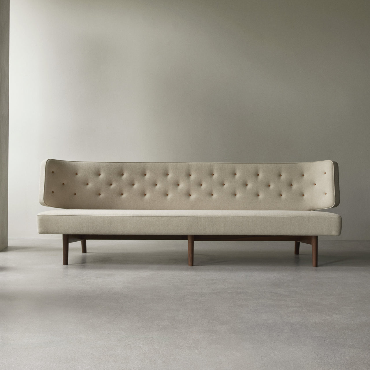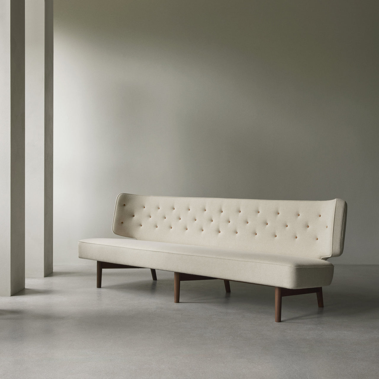 Designed in 1936 for Denmark’s Radio House (today the Royal Danish Academy of Music), Vilhelm Lauritzen's exquisite Radiohus Sofa rightfully takes its place in Audo Copenhagen's select Icons grouping. 3-seater model, the hand-upholstered winged form finished with exacting rows of buttons cradles the body in stylish comfort in this singular reissue.