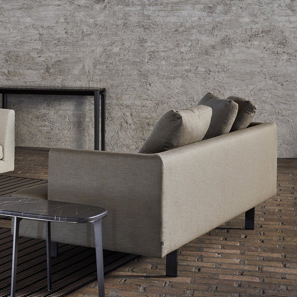 Renowned American designer Edward Wormley inspires this standout sofa—an appealingly relaxed take on midcentury motifs. The buttoned seat cushion alludes to that golden era while the scattered down-filled cushions and generous proportions are decidedly contemporary. The backrest and arms are leanly scaled, yet offer fine back support, while back cushions are baffled for even distribution of feathers and to prevent shifting. The sofa is constructed with a durable steel frame featuring an elastic webbing suspension system similar to an automobile. Edward is available in either fabric or leather, or in fabric with a leather seat, with metal legs finished a dark bronzato.