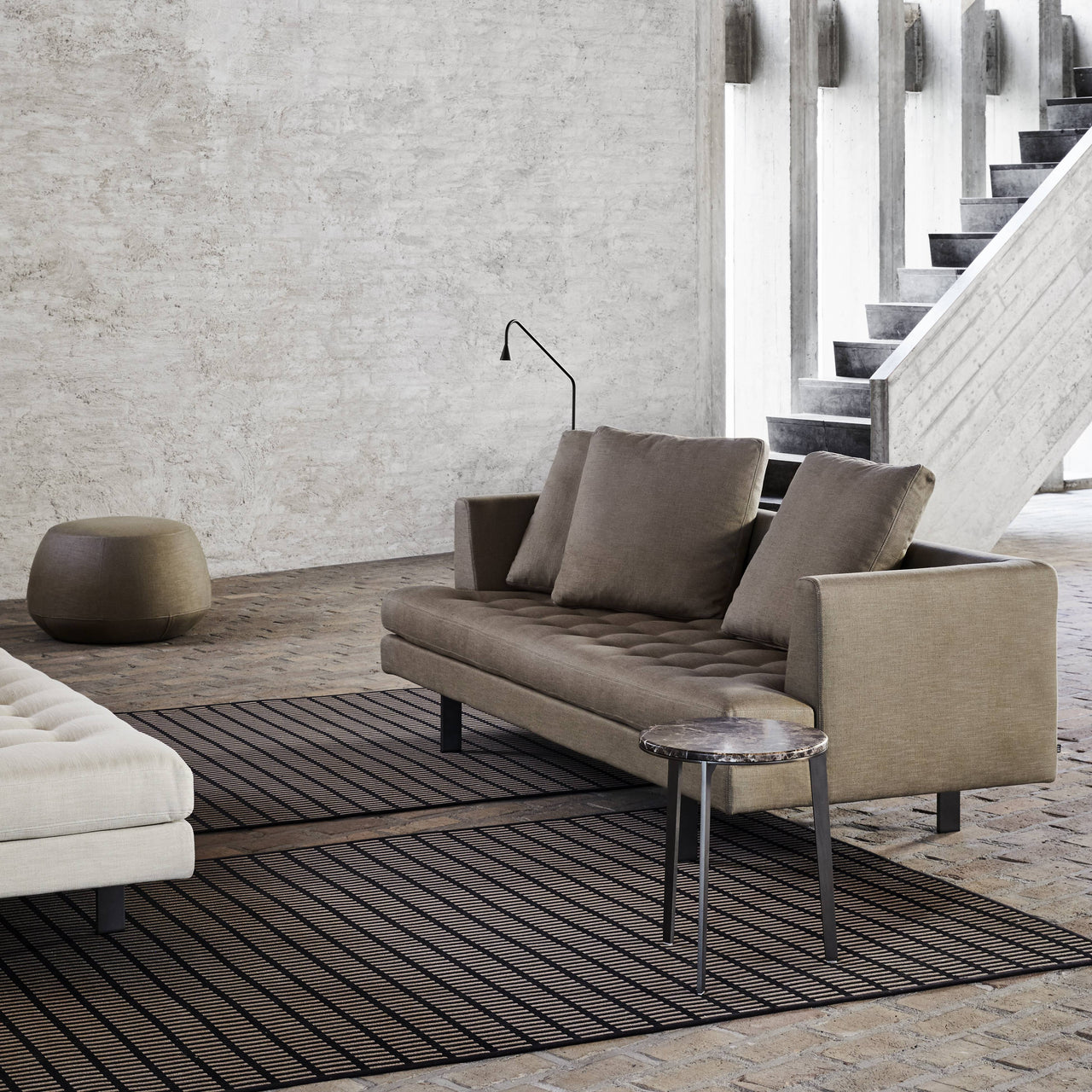 With its 210 version, Bensen offers a standard-sofa size version of its Edward seating, a contemporary reinterpretation of the midcentury designs of Edward Wormley. The sofa utilizes a number of production innovations for improved comfort, including a steel frame with a webbing suspension system. Echoes of the past era are found in the single seat cushion with button detail while the scattered down-filled cushions and generous proportions reflect current preferences. The slim backrest and arms offer fine lumbar support and the back cushions are baffled for even distribution of feathers and to prevent shifting. The sofa is available in fabric or leather, or notably in fabric with a leather seat; bronzato-finish metal legs.