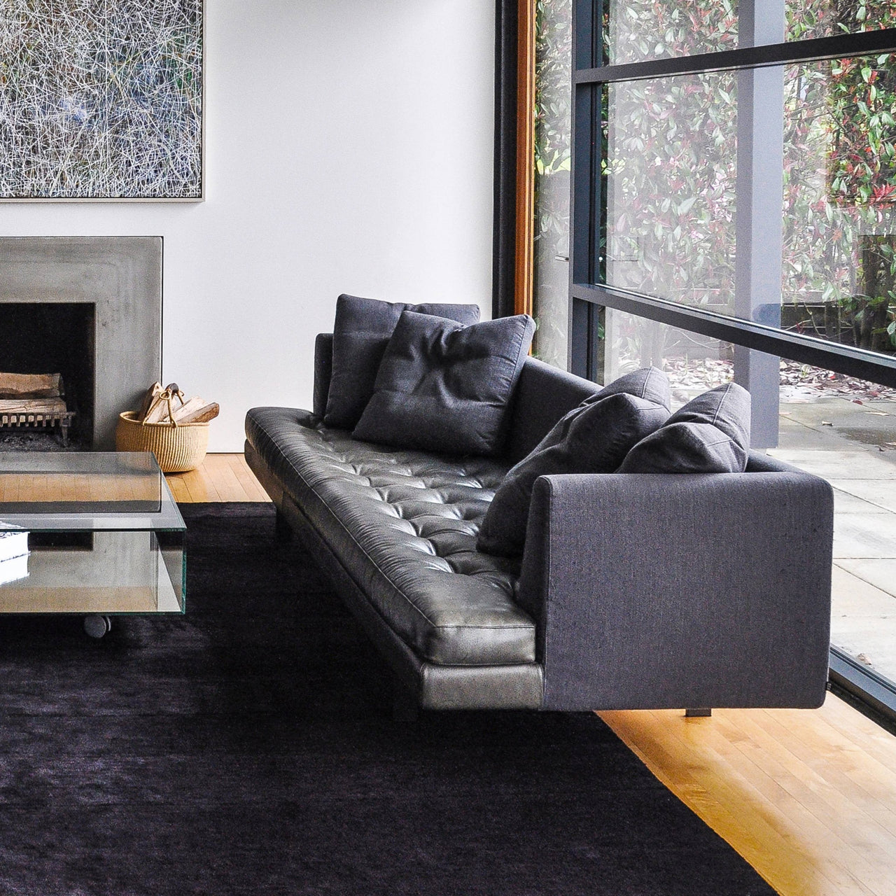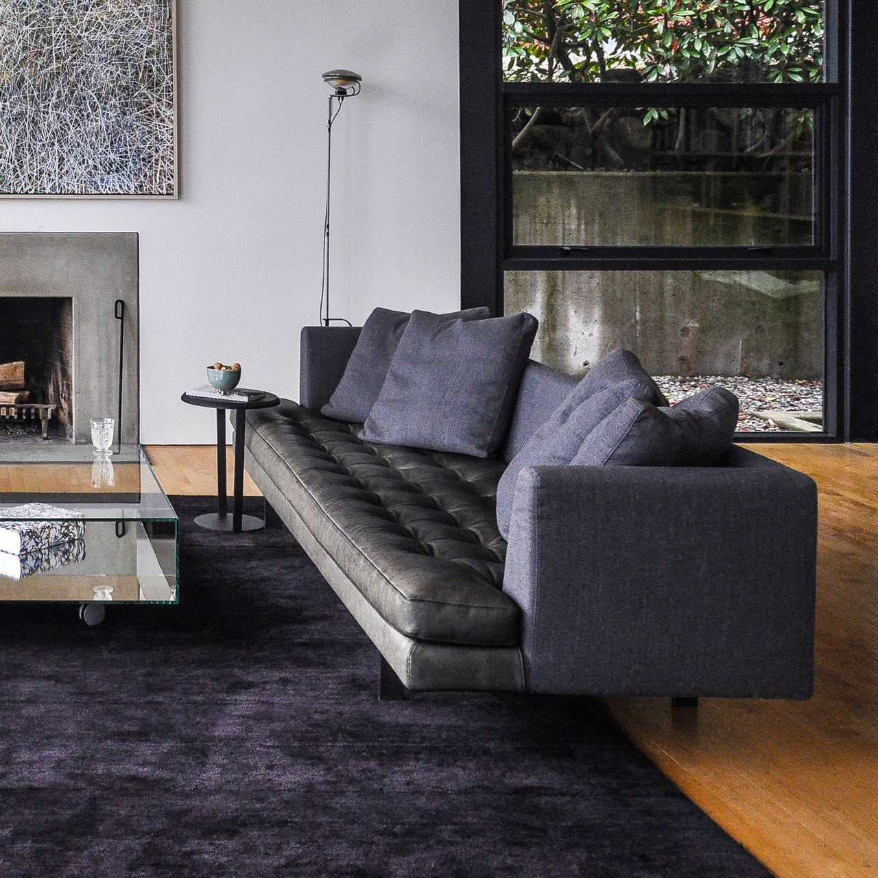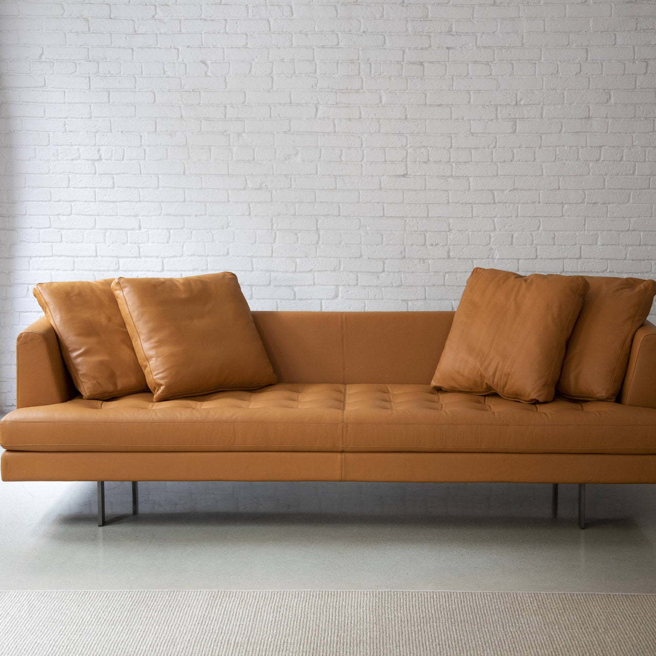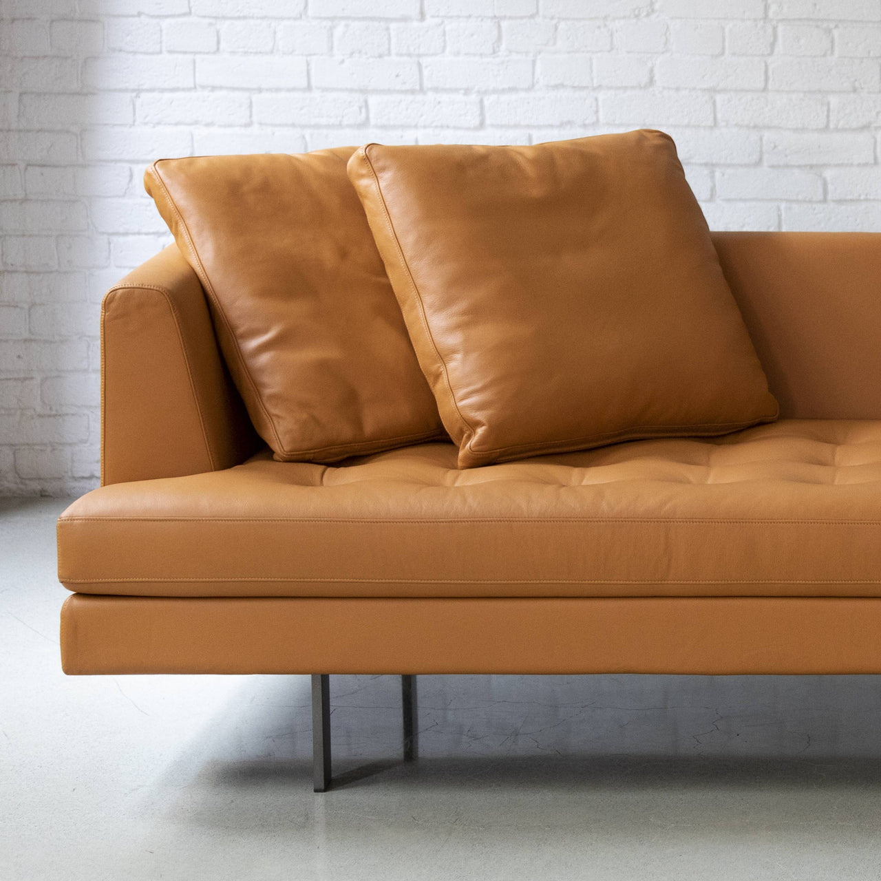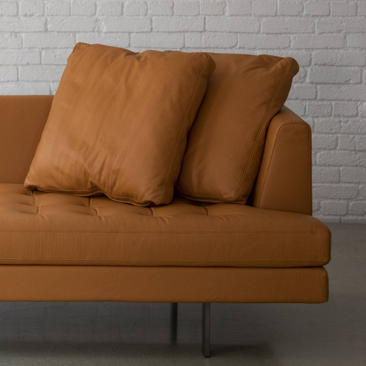 The single seat cushion with its button detail echoes its heritage while the scattered down-filled cushions and generous proportions speak of today. The slim backrest and arms offer fine lumbar support and the back cushions are baffled for even distribution of feathers and to prevent shifting. Upholstery in fabric or leather, or notably in fabric with a leather seat; bronzato-finish metal legs.