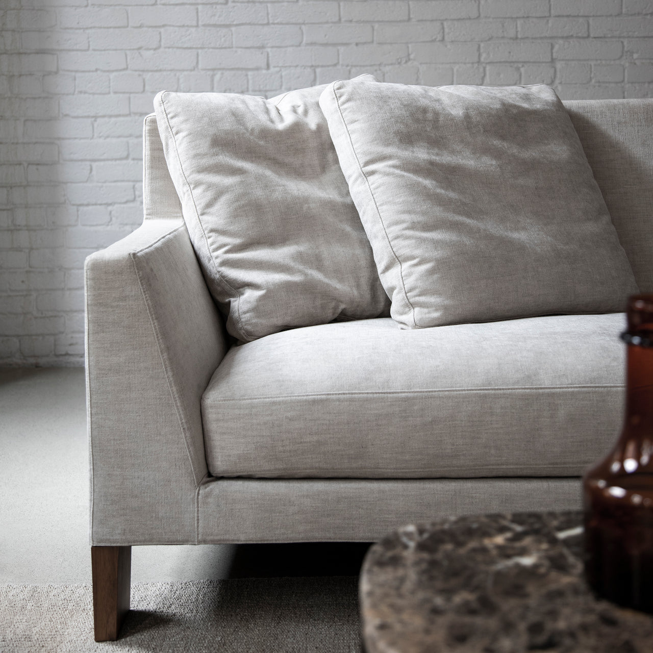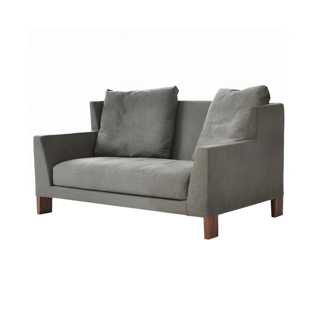 Morgan brings its studiedly casual air to a 2 seater model that's perfect for smaller spaces. An update on the traditional high-back sofa, it has the distinctive cut-away armrests that form comfortable corner nooks and gives full head and shoulder support. Natural wood legs raise the seat to a comfortable height and down back cushions promise "sink-in" comfort.