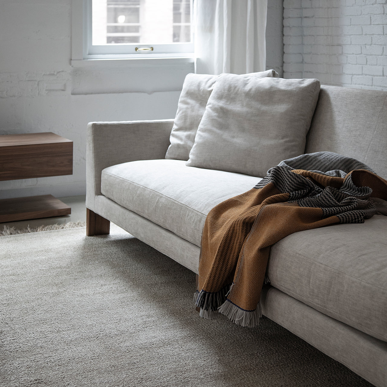 The sofa is built on a durable steel under-frame with bi-directional elastic webbing suspension. A precision-made, wood top-frame and CNC precision-cut foam at the arms and back assure a tailored appearance. Seat cushions have a memory foam core, wrapped in a generous amount of feather and down. Fabric covers are attached by velcro and removable for easy cleaning or replacement.