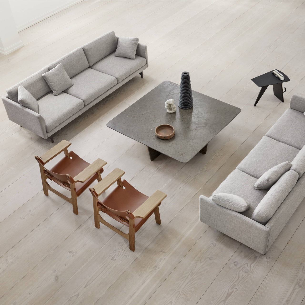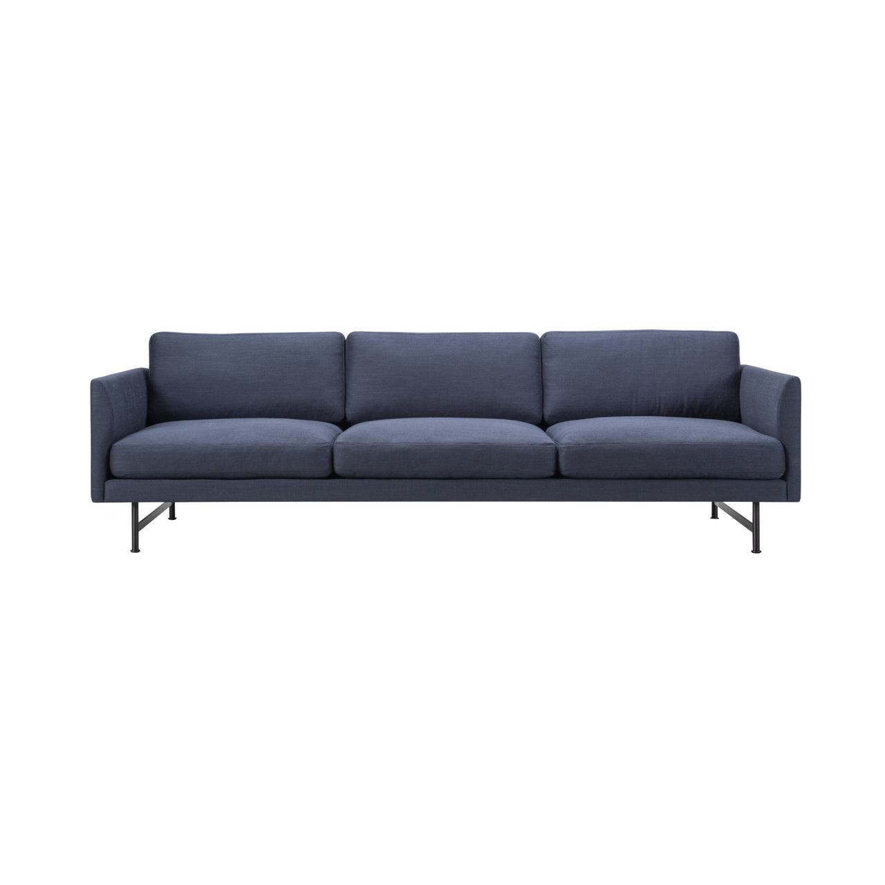 A forward-thinking take on a standard-size sofa, this version of Calmo hovers on slim legs in matte-chrome or black-painted metal finish. London-based designer Hugo Passos tempers the straight lines of the 3 seater with invitingly rounded cushions while the seat depth is equally adaptable to working on a laptop or hours of conversation. With Fredericia’s long expertise in upholstered furniture-making, the sofa’s construction features precisely tailored contours playing against the softer expression of the loose-filling cushions that deliver unfettered comfort.