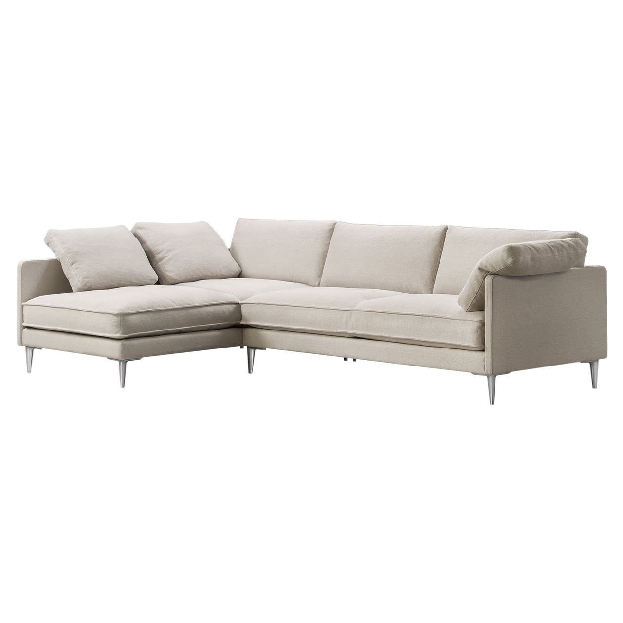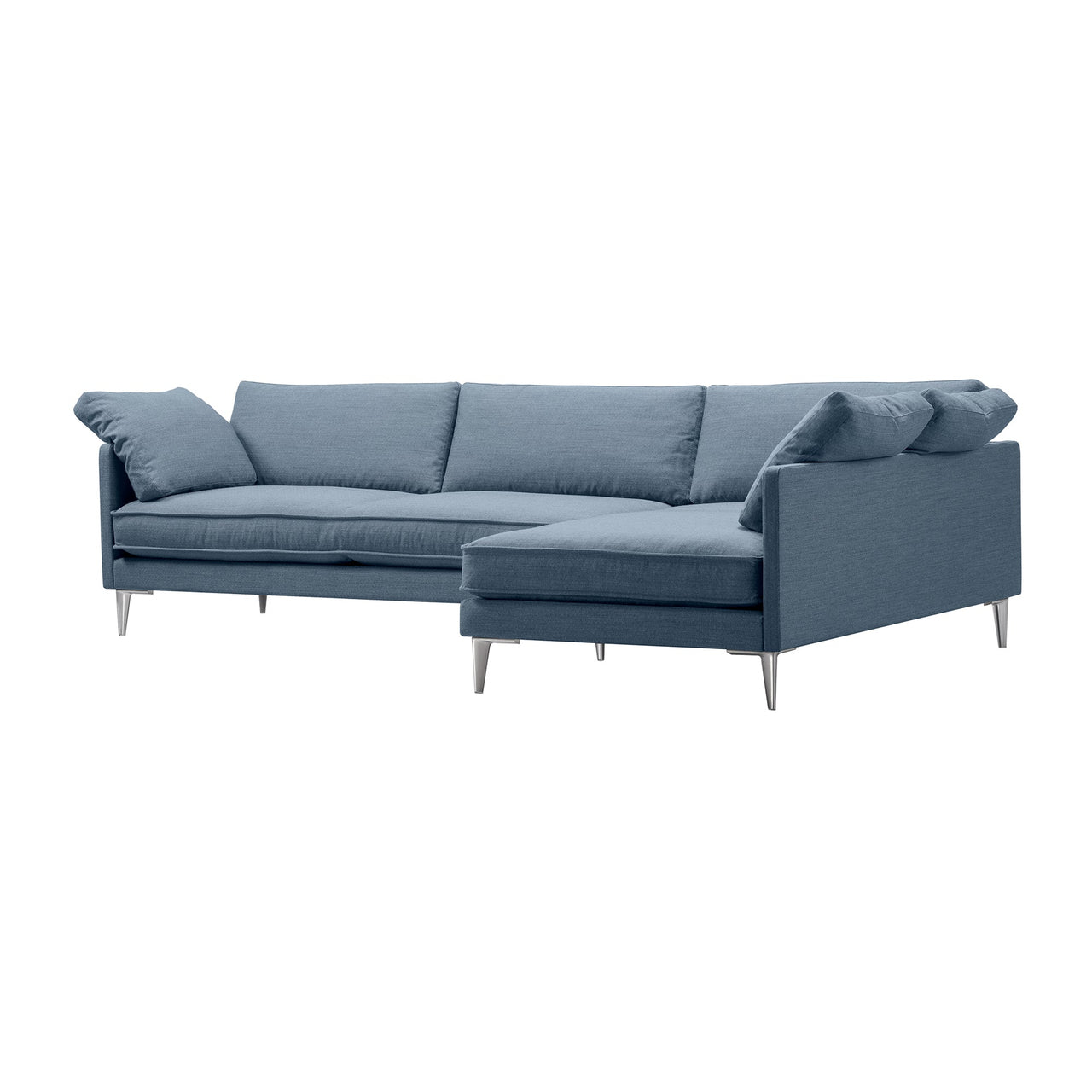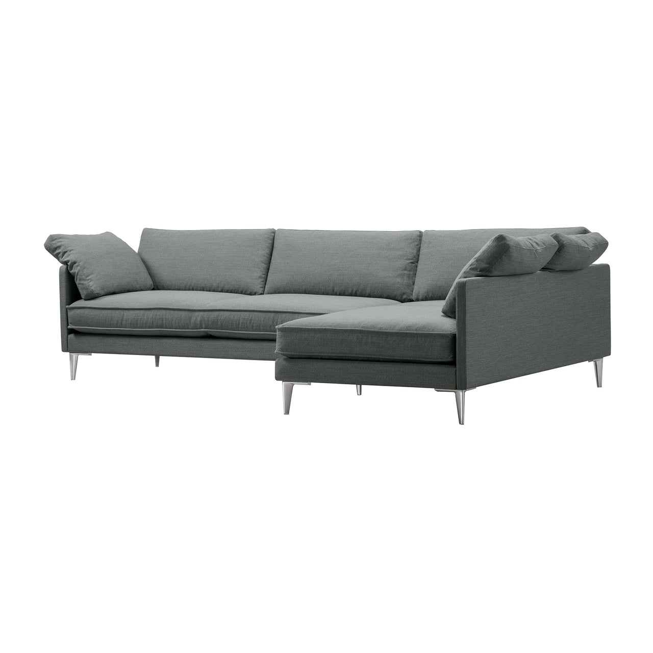 In the expansive large version, Erik Jørgensen Studio adapts its luxuriously appointed sofa-chaise EJ295. Voluminous cushions provide a high degree of comfort, and the seating hybrid makes it possible to lie down and sit in different positions. Refined upholstery details include piping at the edges along with the option of loose cushions for an added nonchalance. Placed in the center of a room or hugging a corner, the somewhat low-to-the-ground sofa rests on slender aluminum legs for a clean finish.