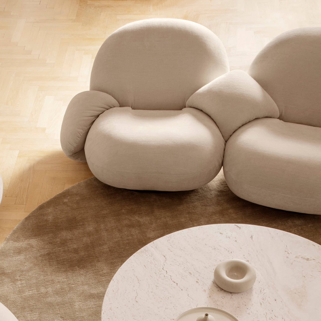 Pierre Paulin’s 1975 vision of sitting on a cloud formation is enhanced with armrests on the sides and middle providing even more support and allowing one to lean with ease. Now reissued by Gubi, Pacha’s 2 Seater reveals the French designer’s obsession for ergonomic precision and exacting craftsmanship behind the sofa’s hyper-relaxed contours. A choice of black or pearl gold base and a wealth of upholstery options combine to offer a completely customizable version of this now iconic seating.