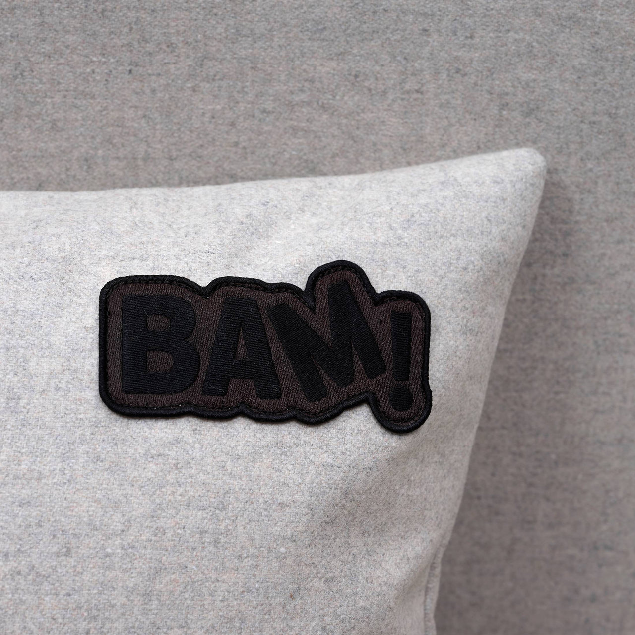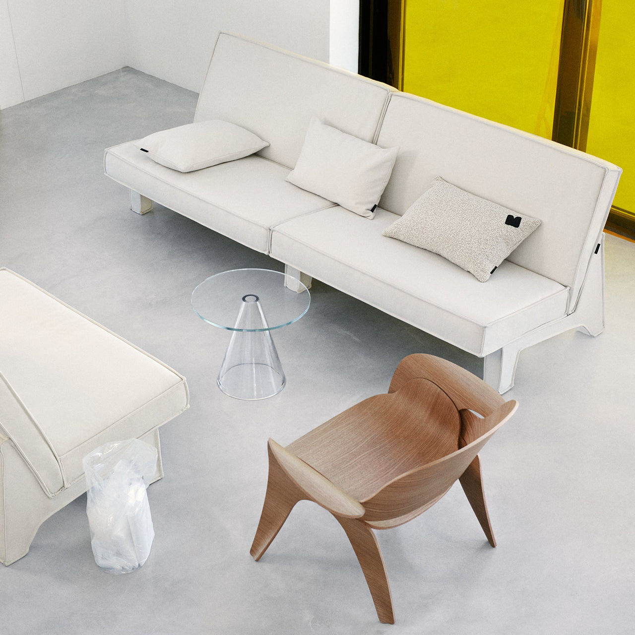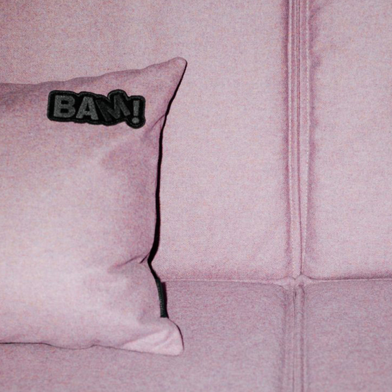 Just as the Pop movement stunned the art world, BAM! shakes up the idea of a sofa, here in an extended version that combines a pair of 2-seater sections. Massproductions co-founder and chief designer Chris Martin plays up the geometry of block-shaped cushions for the armless seat and back, filled with recycled goose and duck feathers (sterilized via high temperature without chemicals). Buttress-like legs come upholstered in the same material and one of the back cushions sports a black embroidered logo patch, a nod to the American artist Roy Lichenstein. BAM! is delivered in eco-smart flat packaging and easily assembled with few components.