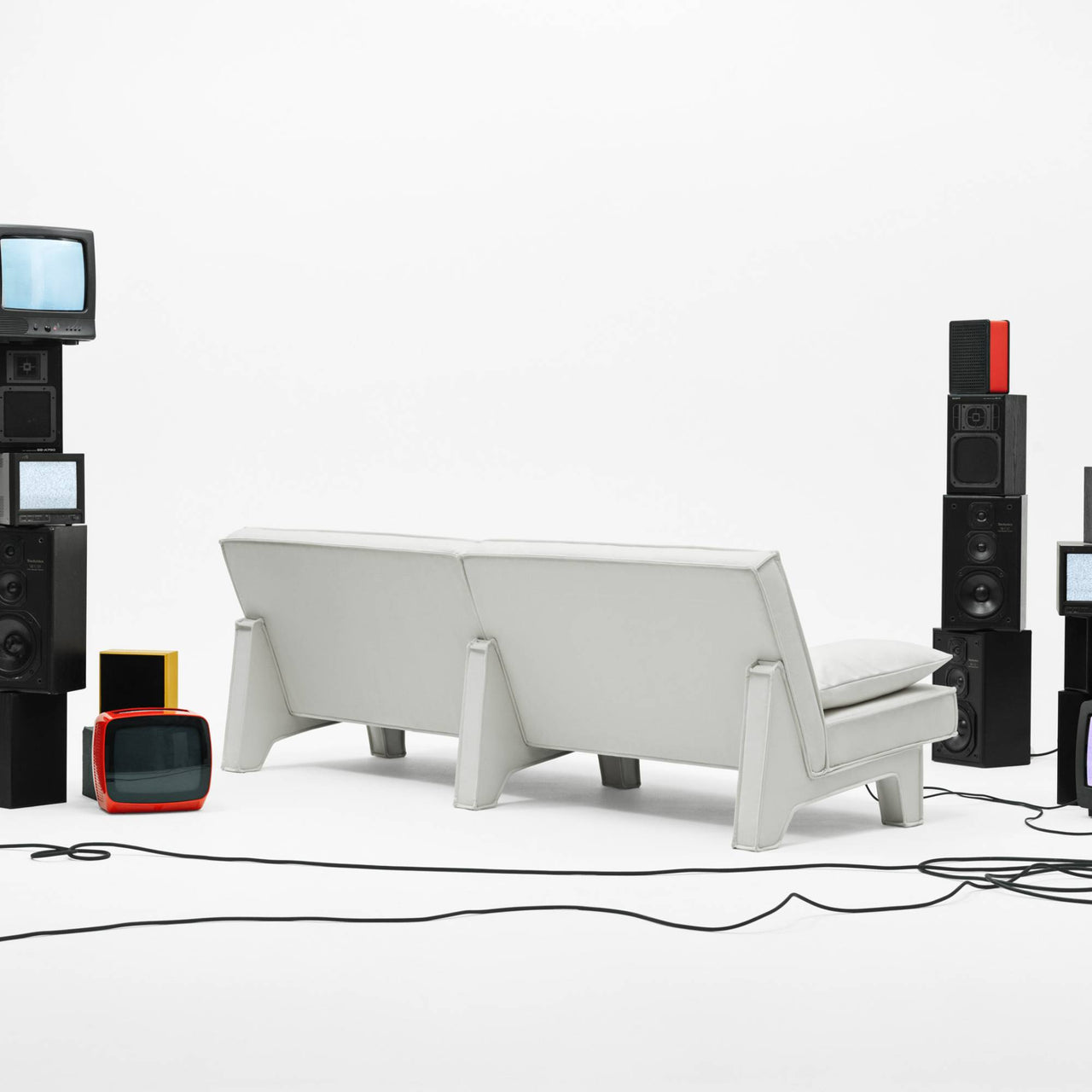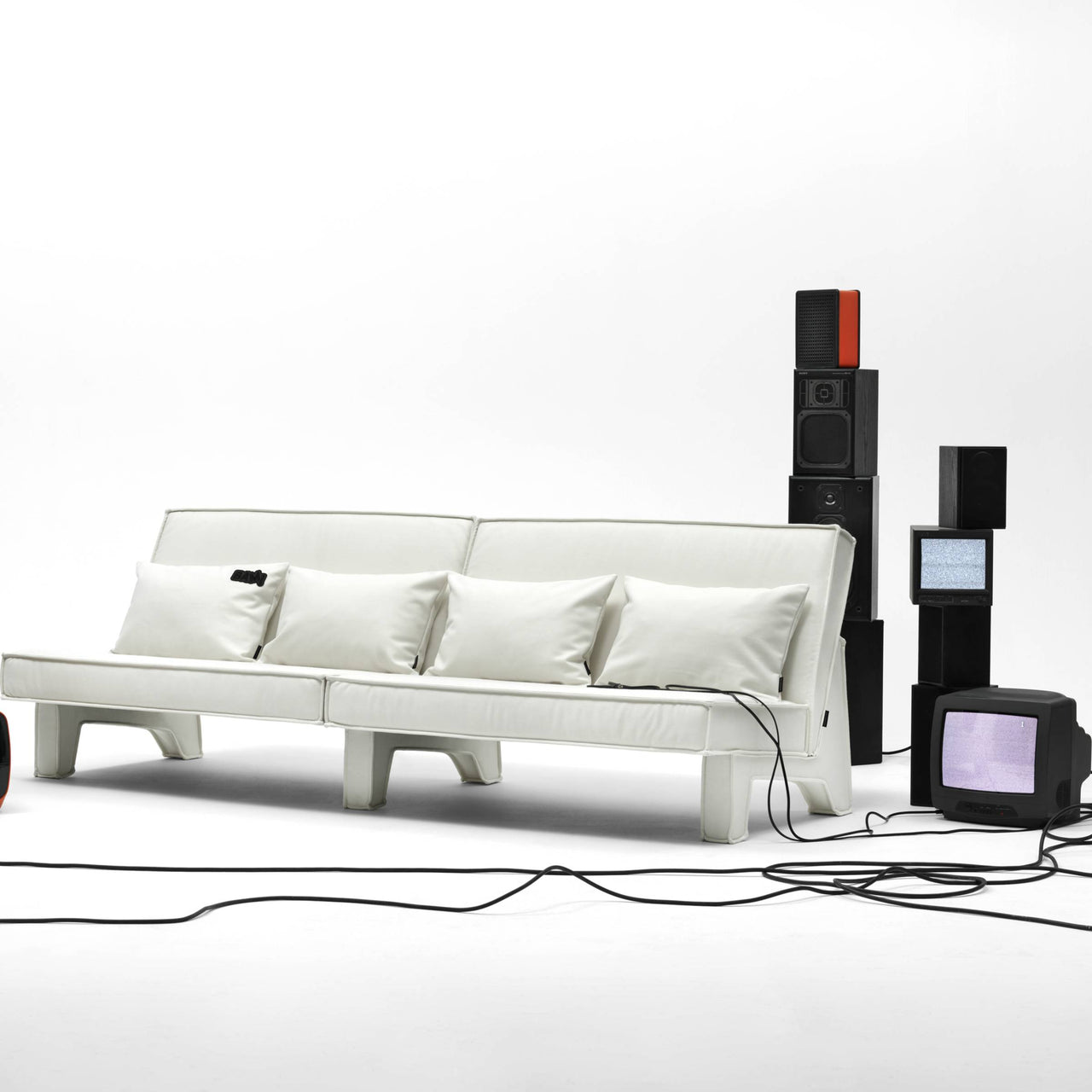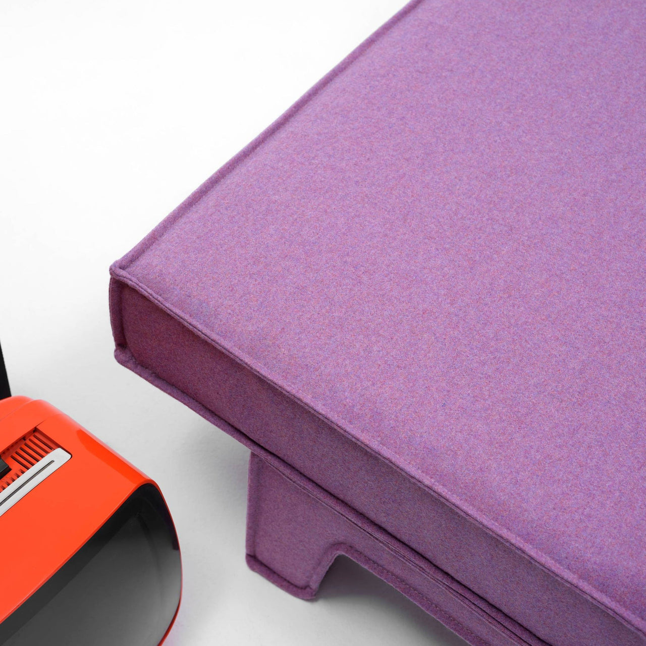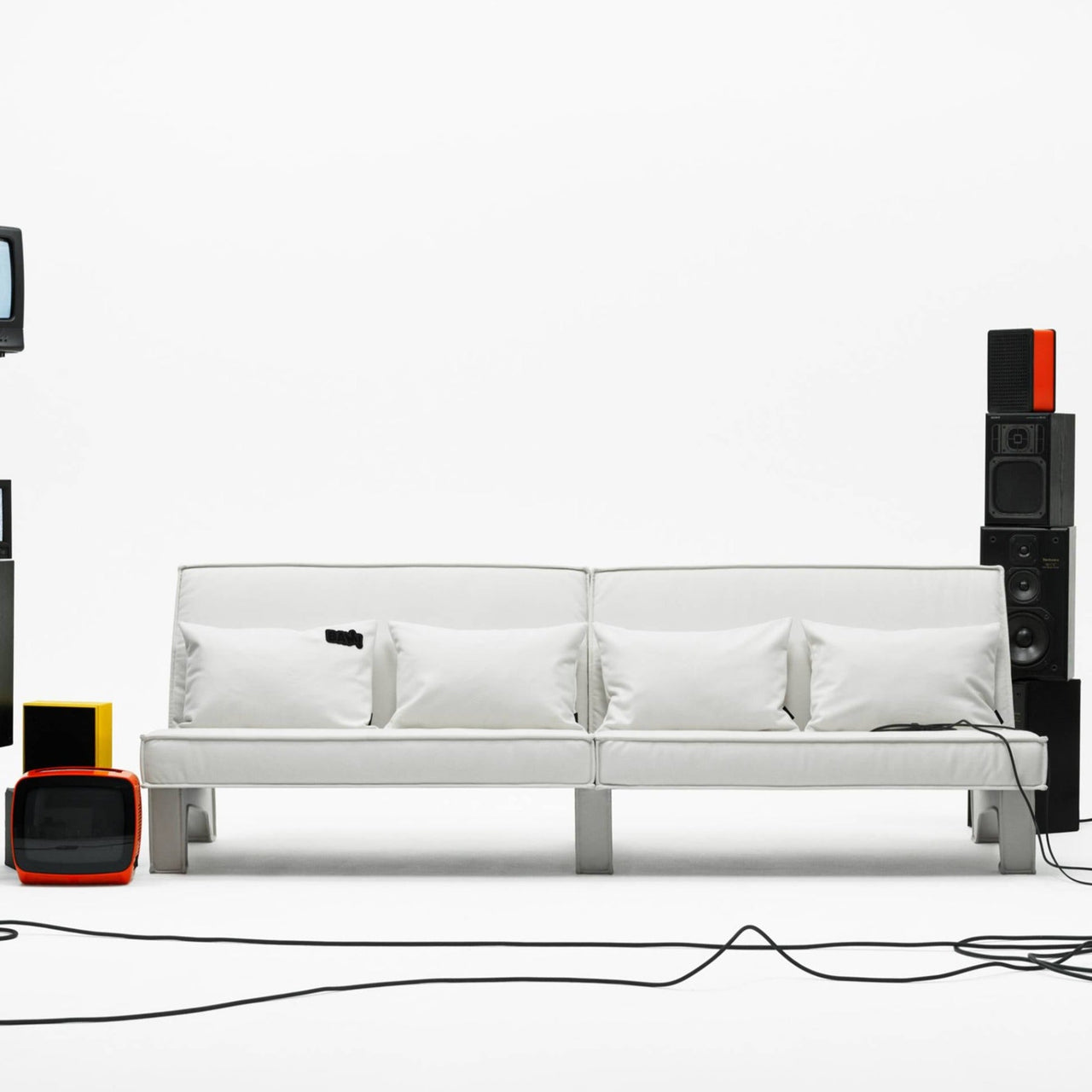 Just as the Pop movement stunned the art world, BAM! shakes up the idea of a sofa, here in an extended version that combines a pair of 2-seater sections. Massproductions co-founder and chief designer Chris Martin plays up the geometry of block-shaped cushions for the armless seat and back, filled with recycled goose and duck feathers (sterilized via high temperature without chemicals). Buttress-like legs come upholstered in the same material and one of the back cushions sports a black embroidered logo patch, a nod to the American artist Roy Lichenstein. BAM! is delivered in eco-smart flat packaging and easily assembled with few components.