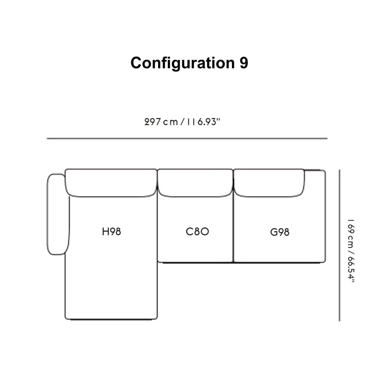 - Configuration: 6 - 9: 27.6" h x 116.9" w x 66.5" d (70x297x169cm)