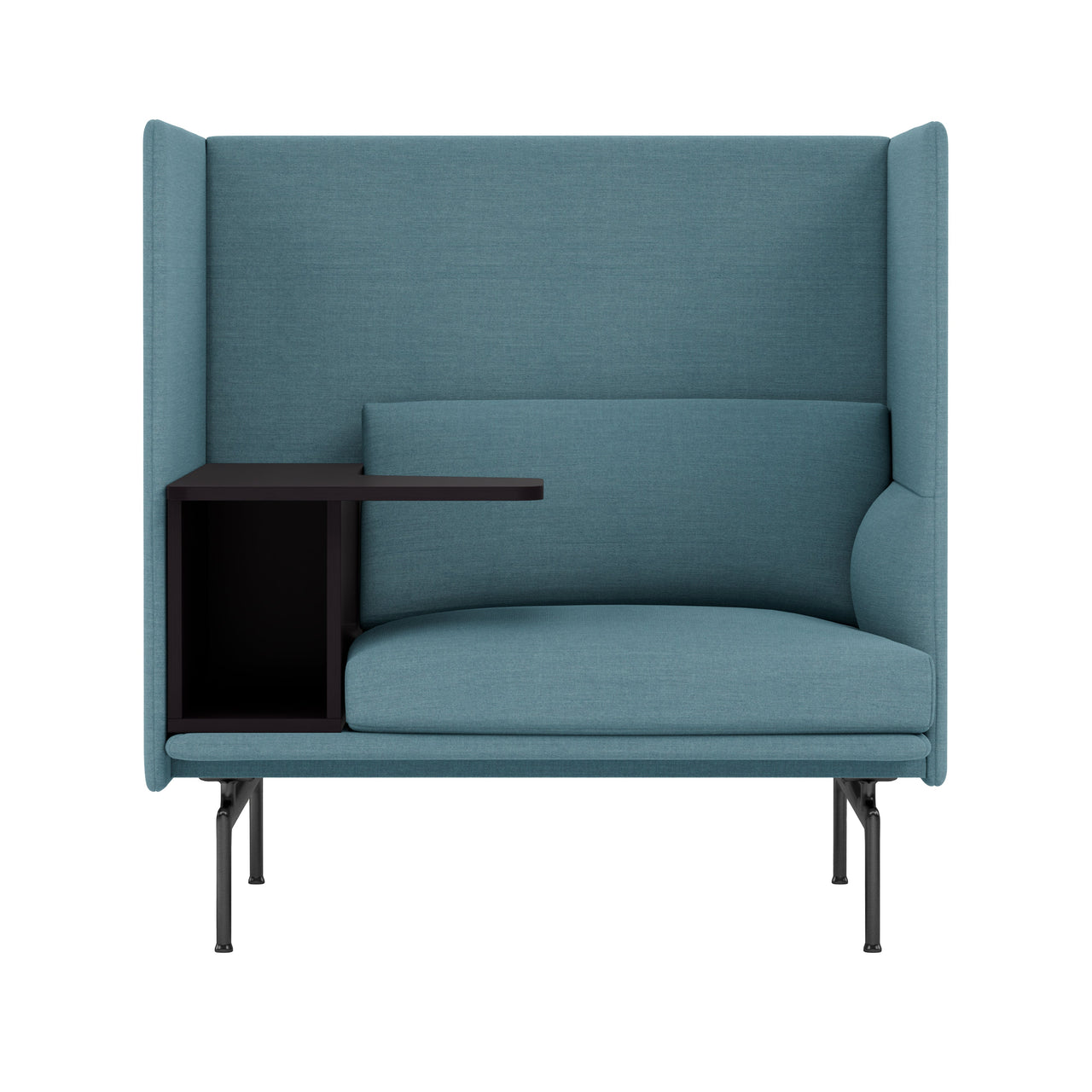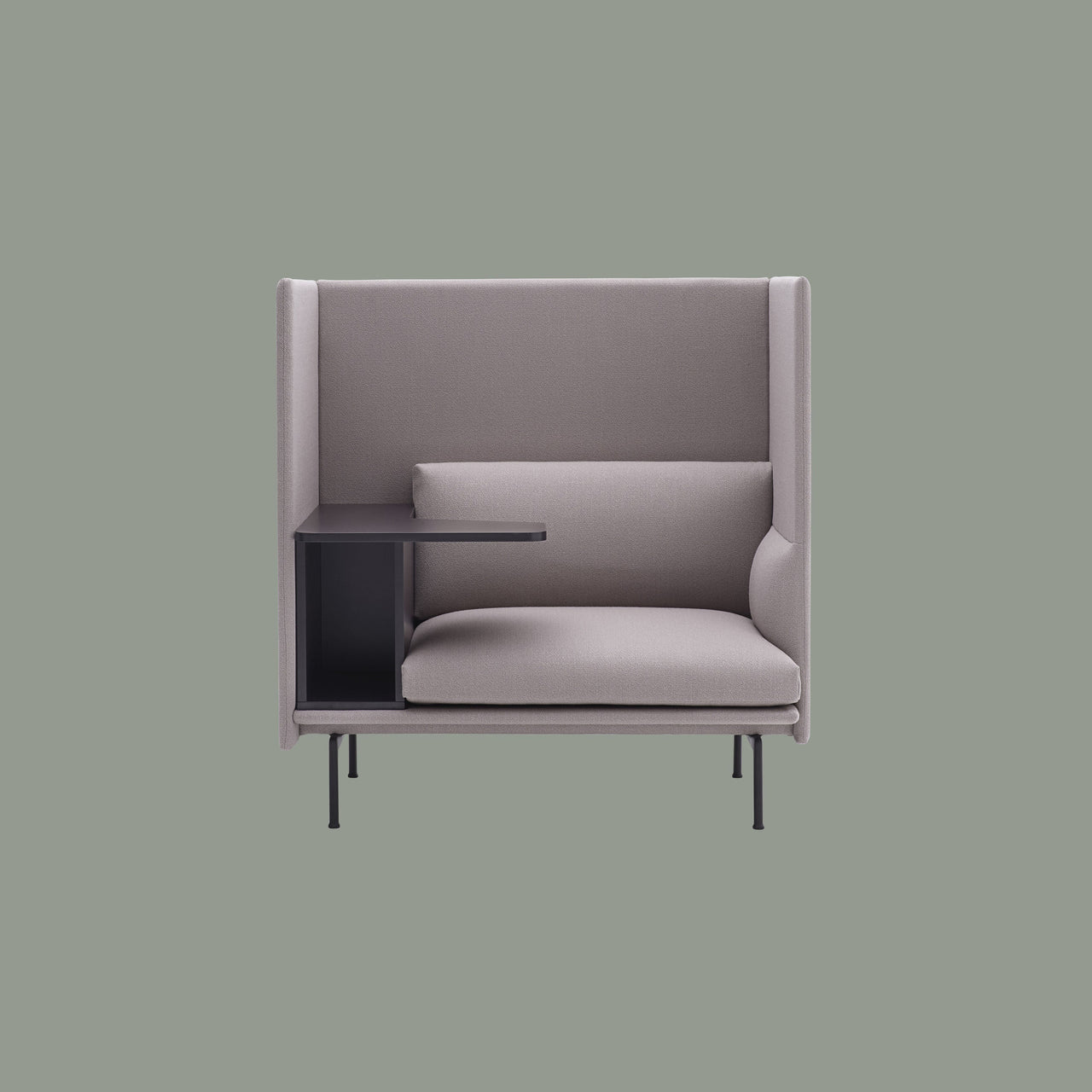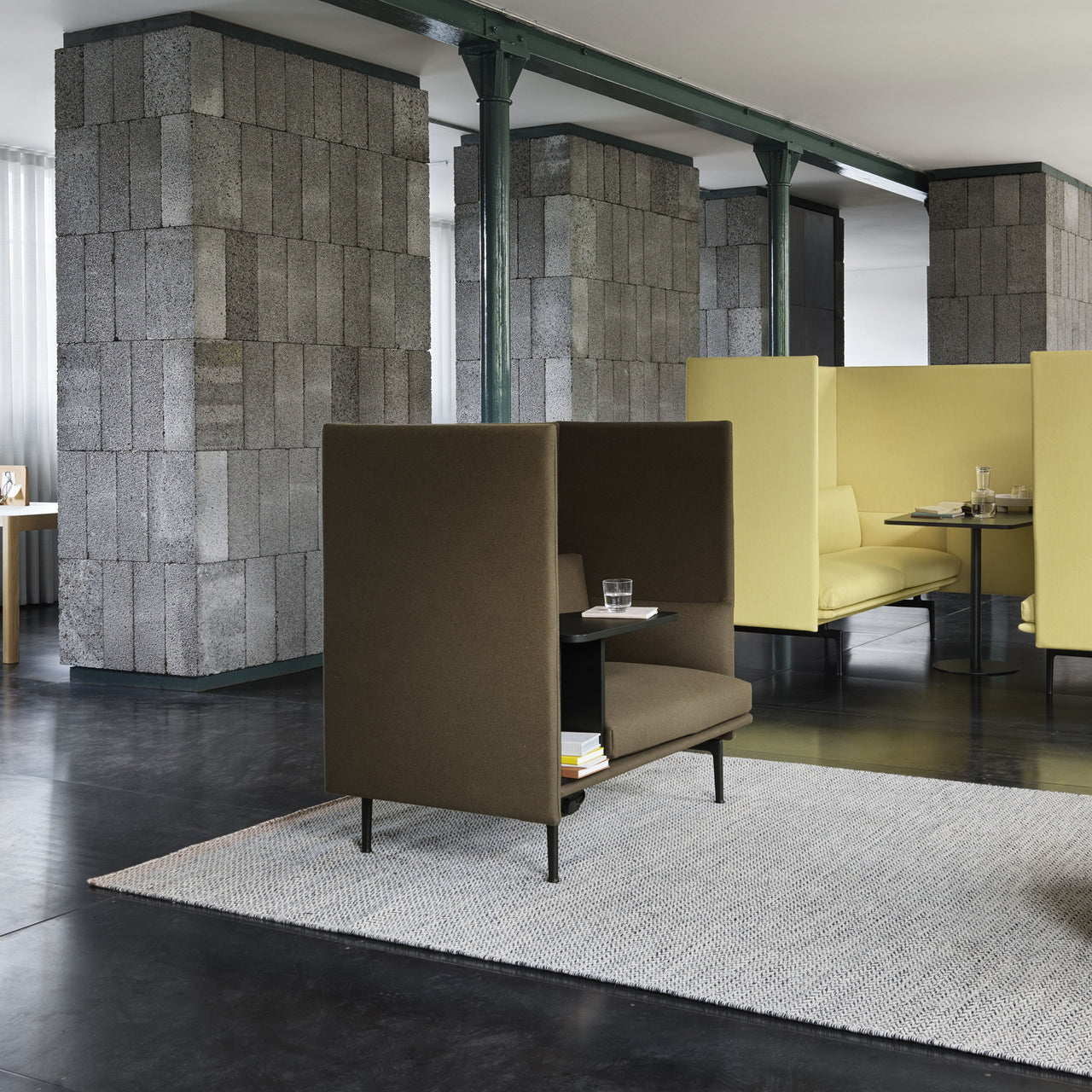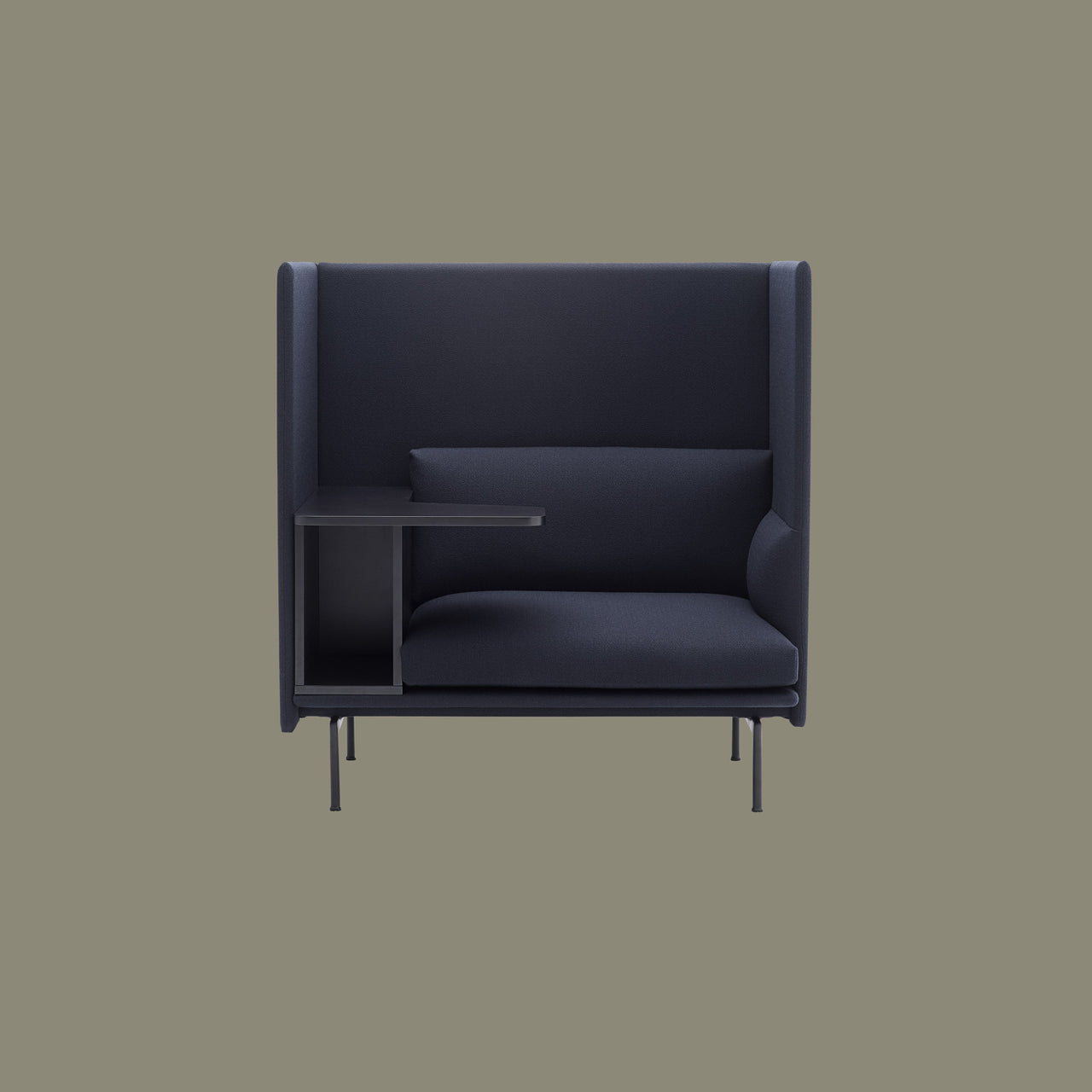 Highback Work extends the clean lines of the Outline seating series, creating an acoustic and spatial enclosure with an integrated desk-storage cubby and handy cable outlet. With a choice of premium stock upholstery selections, the seating is available with left or right orientation and features durable wood and steel construction, cold-foam fill and black powder-coated or polished aluminum legs. The work table in black MDF with a matte lacquer finish makes it an ideal fit in any open-plan space, hospitality setting or workplace.