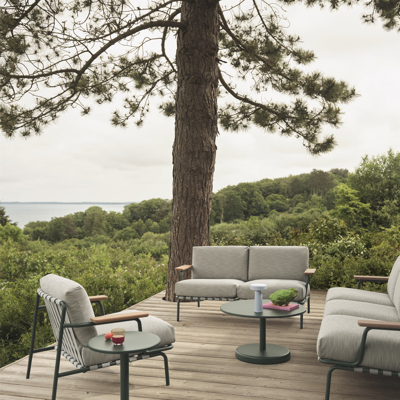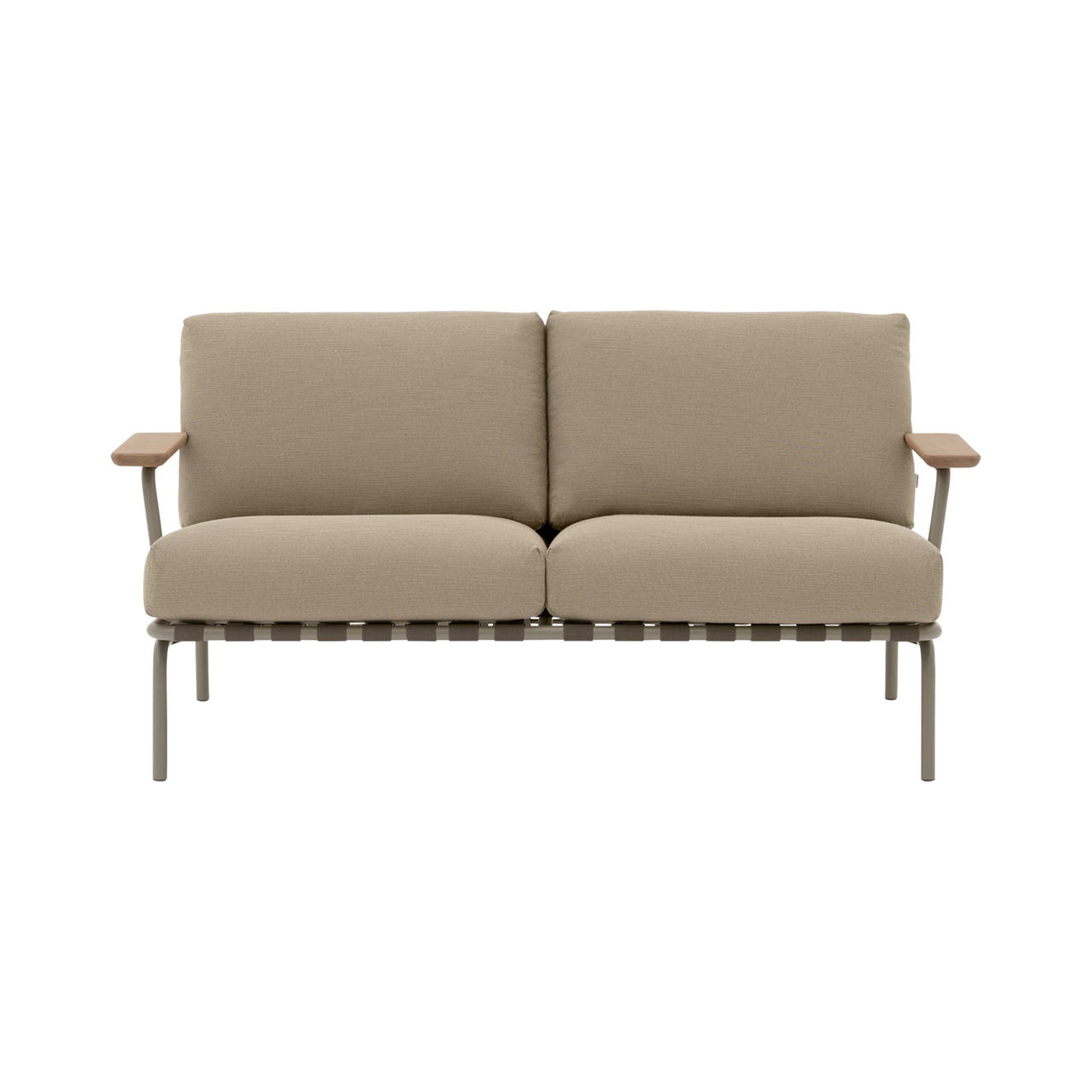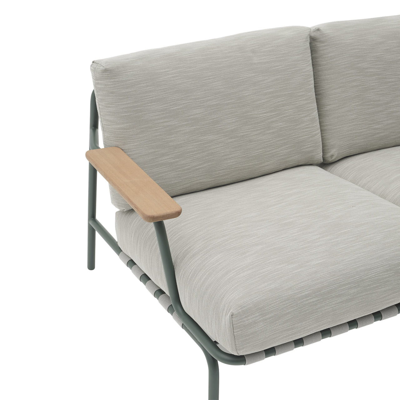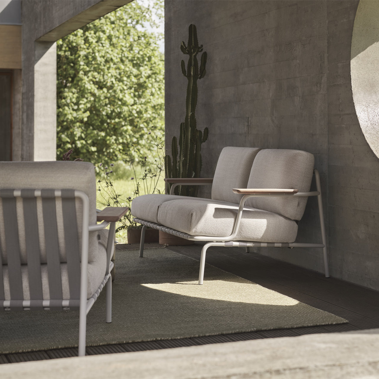 The Settle 2-seater Sofa is crafted with an airy steel frame, visible belts, and intricate details that catch the eye from every angle. The armrests, made from FSC™-certified sapele mahogany wood, provide a warm and natural touch. The plush cushions, designed with quick-dry foam and durable outdoor fabrics, dry quickly and easily withstand the outdoors.