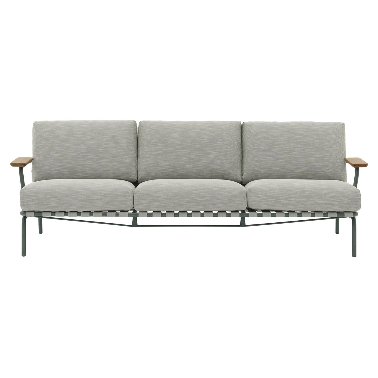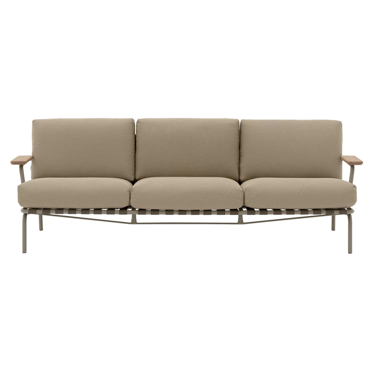 The Settle 3-seater Sofa is designed with an airy steel frame, visible belts, and intricate details that create visual interest from every angle. The armrests, crafted from FSC™-certified sapele mahogany wood, provide a warm and tactile touch. Plush cushions with quick-dry foam and durable outdoor fabrics ensure comfort and resilience, even during rain showers.