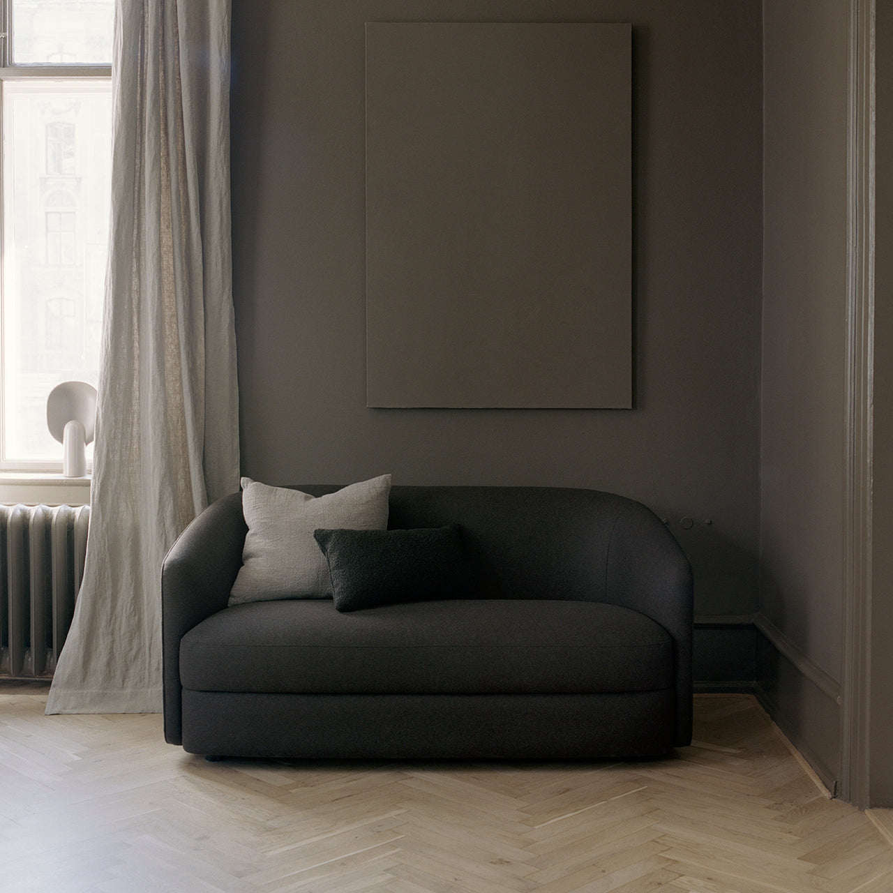 Beckoning with its welcoming open contours, Covent Sofa offers a comfortably upholstered expression, extended to the floor and crowned with a luxuriously deep seat cushion. In either 2-seater or 3-seater models, New Works offers a selection of subtly toned fabrics with expedited delivery for its beautifully crafted and timeless standout.