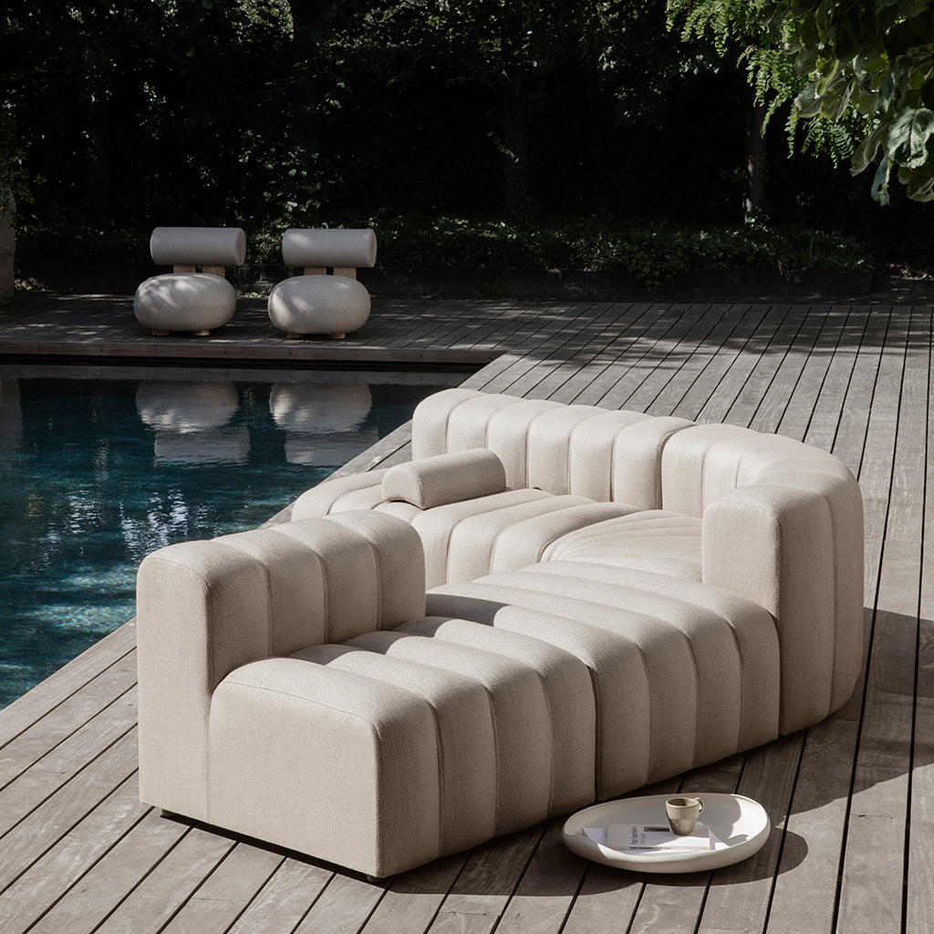 The Studio Outdoor Sofa Modules are designed to bring the comfort of indoor lounging to outdoor spaces. These modular units are upholstered in UV-protective and water-resistant Sunbrella fabrics, ensuring durability against the elements. The system features a 360-degree finish, meaning each module can stand alone or be combined using a Click-Link system to create versatile configurations. The fluted upholstery and soft lines, inspired by 1970s lounge styles, offer a retro-charm. The structure uses marine plywood and quick-drying foam for added outdoor resilience.